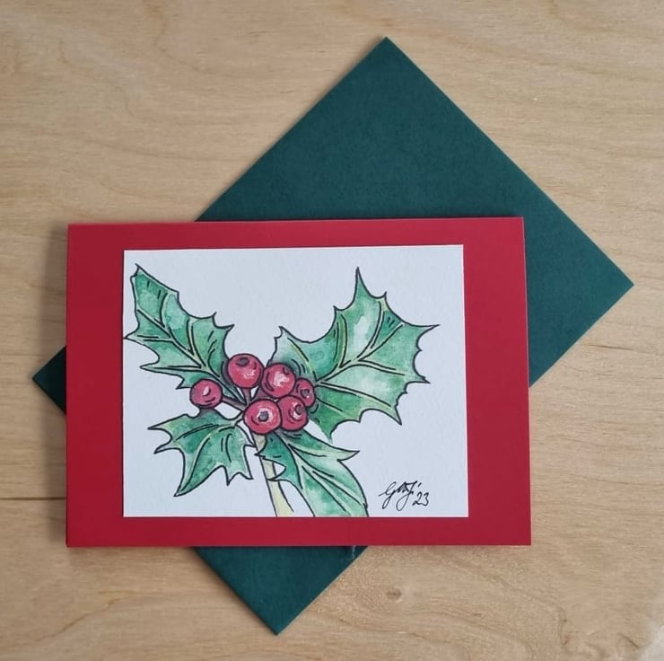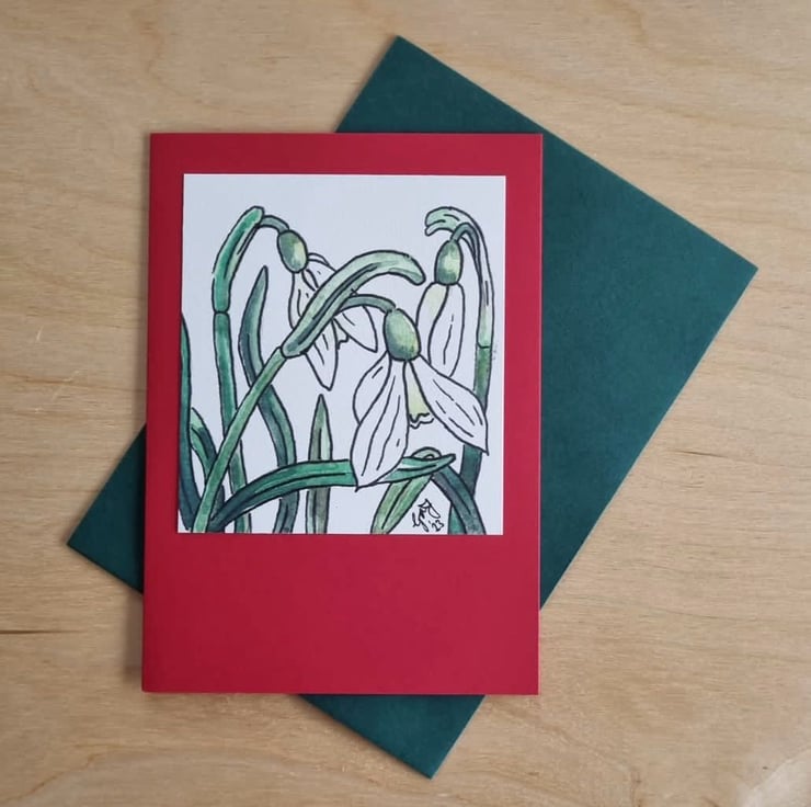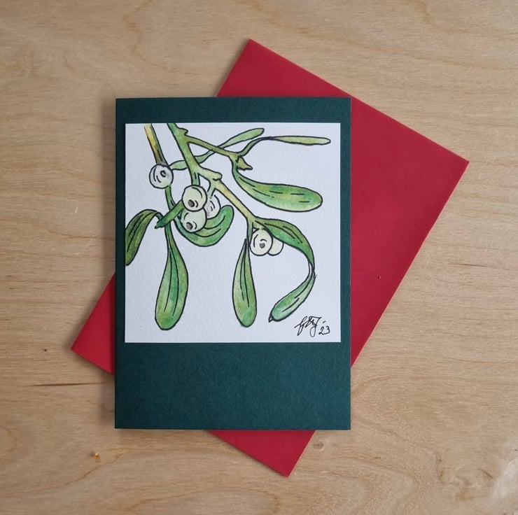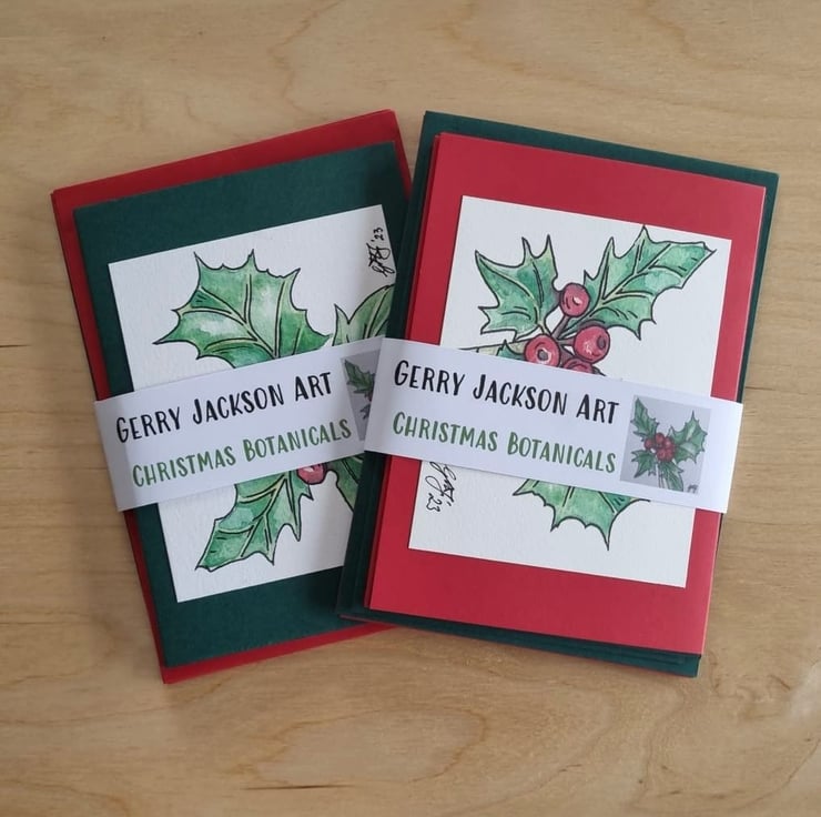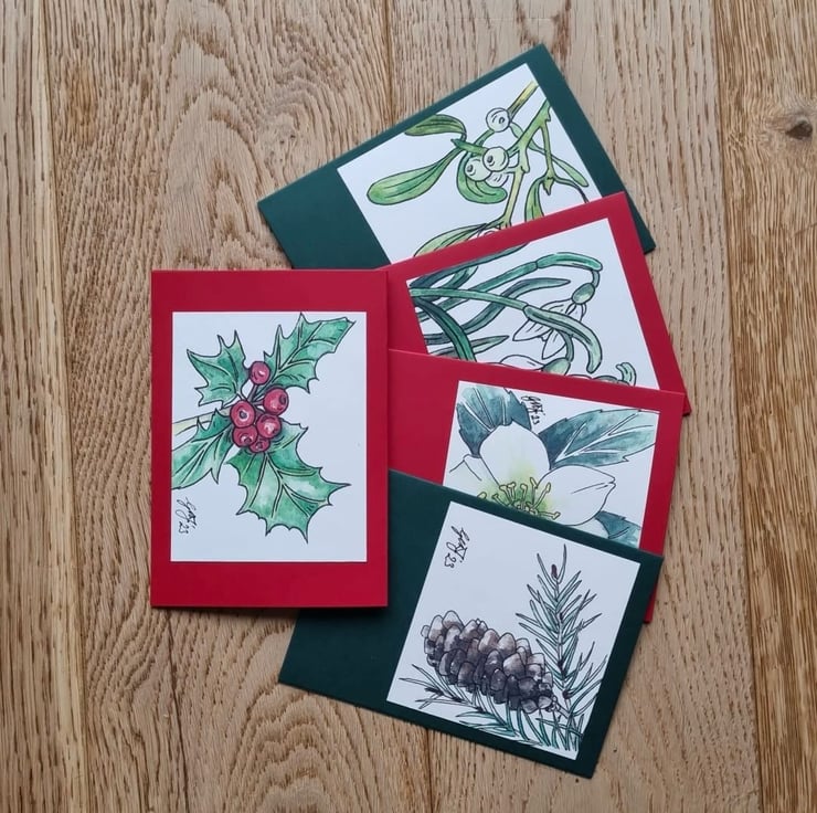 A pack of 5 cards featuring Christmas botanical prints. The originals were made using watercolour and pen. Each pack includes 'Holly', 'Mistletoe', 'Snowdrops', 'Hellebore Niger' and 'Pine Cone' mounted on a mixture of red and green card with a contrasting envelope.