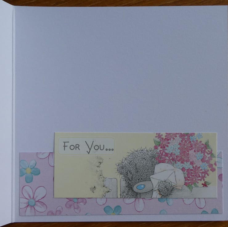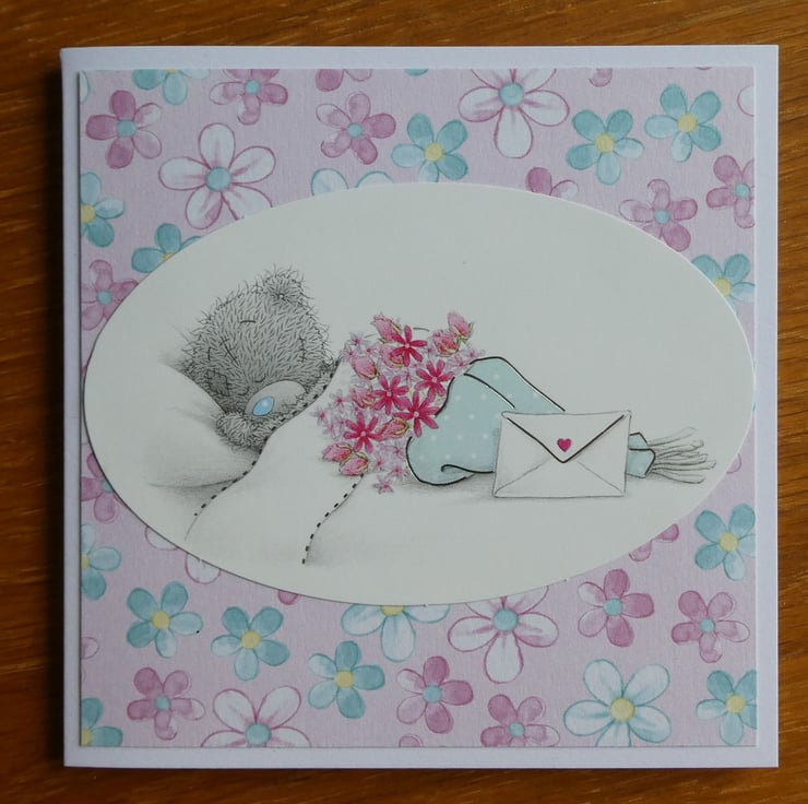 Tatty Teddy sleeping with a boquet of flowers and the message 'For You'.