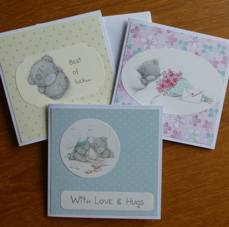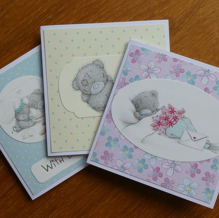 This pack of 3 uniqueTatty Teddy cards has been made with a selection of papers, card, images and greetings, in different combinations of polka dot and floral patterns in soft pastel colours.