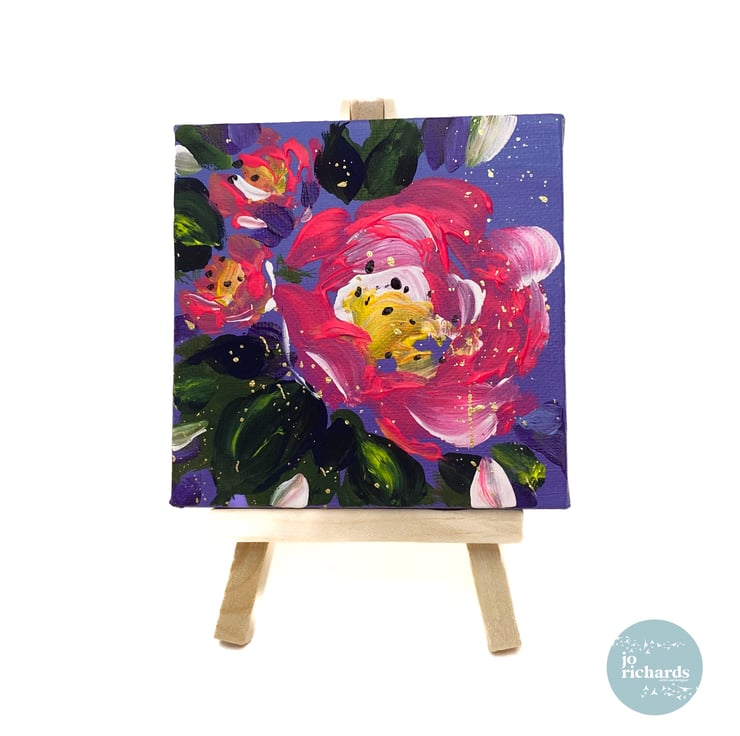 10x10cm mini hand painted canvas, one of a kind, signed and dated by the artist. Comes complete with mini display easel, wrapped and delivered within the UK.