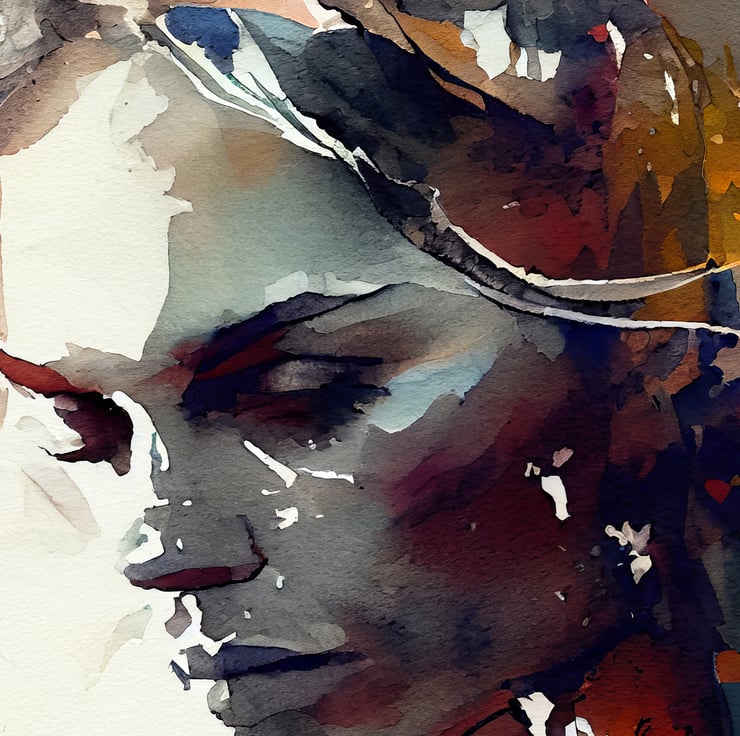 Enrich your art collection with the depth and emotion of this Abstract Woman Portrait Print. The 5"x7" size is perfect for personal spaces that crave a touch of sophistication and artistry. This print showcases an evocative portrayal of a woman's face in a cascade of watercolor washes, blending realism with abstract form in a dance of color and shadow.