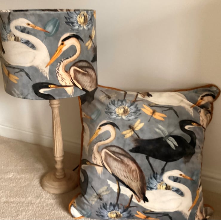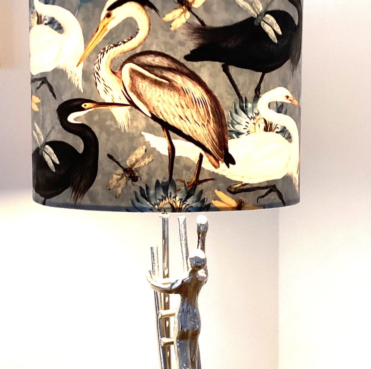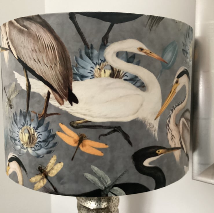 This lovely oval lampshade in grey velvet with cranes adorning it has a white liner as this allows the cranes to stand out when the lamp is lit . comes as a oval shape 30 cm across by depth of 22 cm and a height of either 25 cm or 30 cm also 40 cm across size available as 25 cm height or 30 cm height (as in photo )