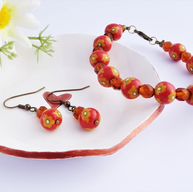 The orange flower pattern beads have been handmade from polymer clay. They feature mustard yellow flowers with white centres set against a burnt orange background. The beads have been finished with two coats of gloss varnish to enhance their colours and give a subtle shine.