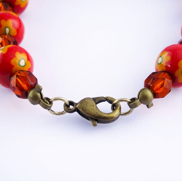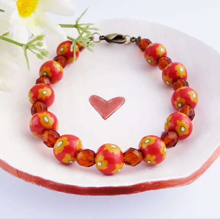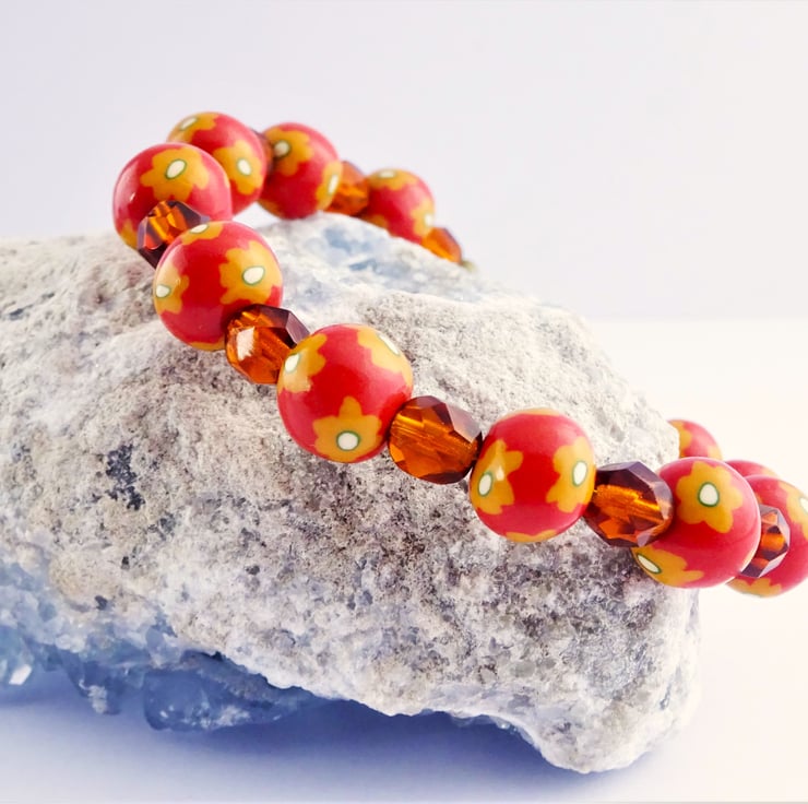 The handmade floral beads are alternated with dark orange glass faceted beads on beading elastic.