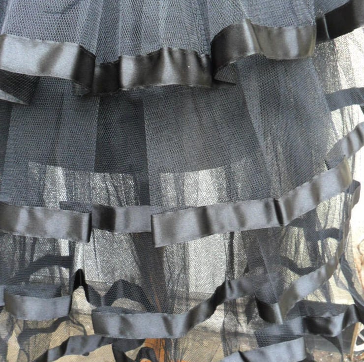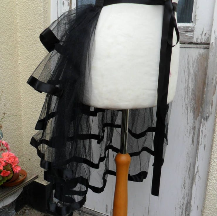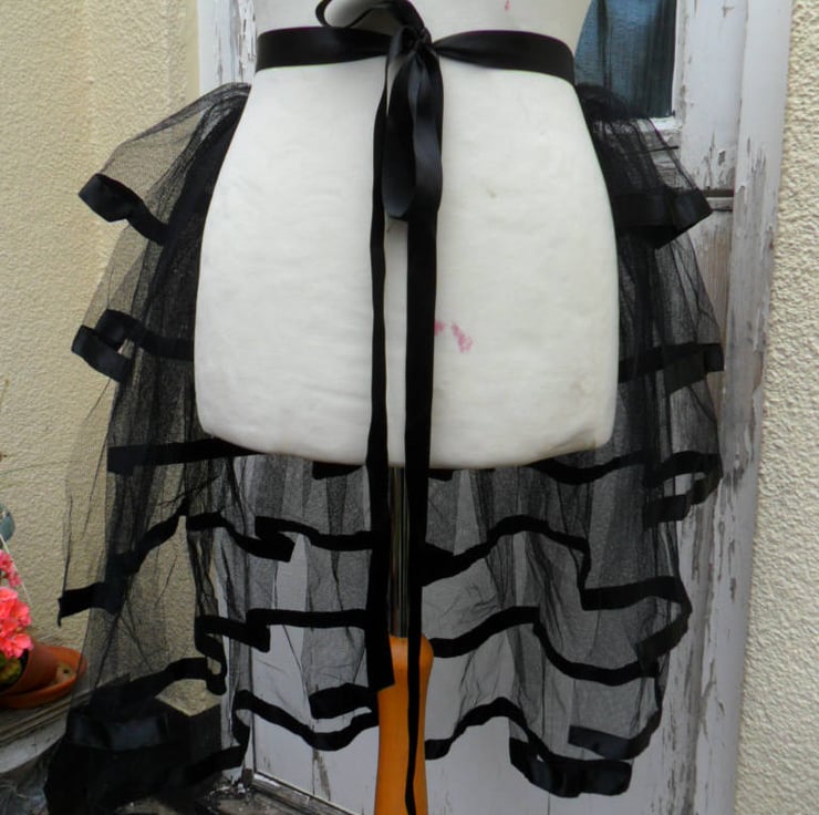 A black net bustle trimmed with black ribbon. The bustle has 6 tiers and is on a ribbon that ties around your waist. Looks great with a corset.