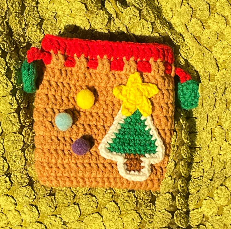 Hand-knit with love, this delightful bag features a standalone Christmas tree adorned with colourful ornaments, set against a lush pine green backdrop. The drawstring closure? It's a charming green treat, adding a touch of whimsy to your festive ensemble!