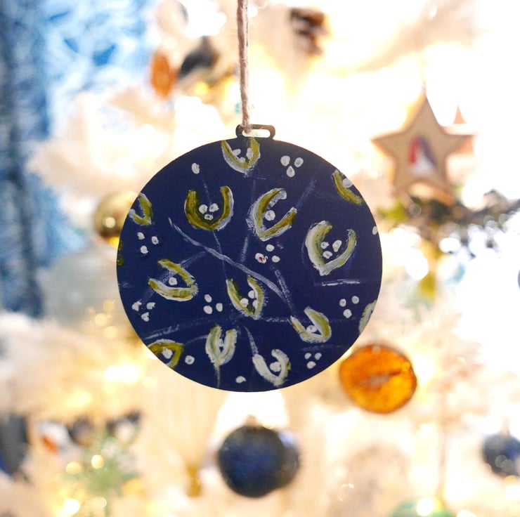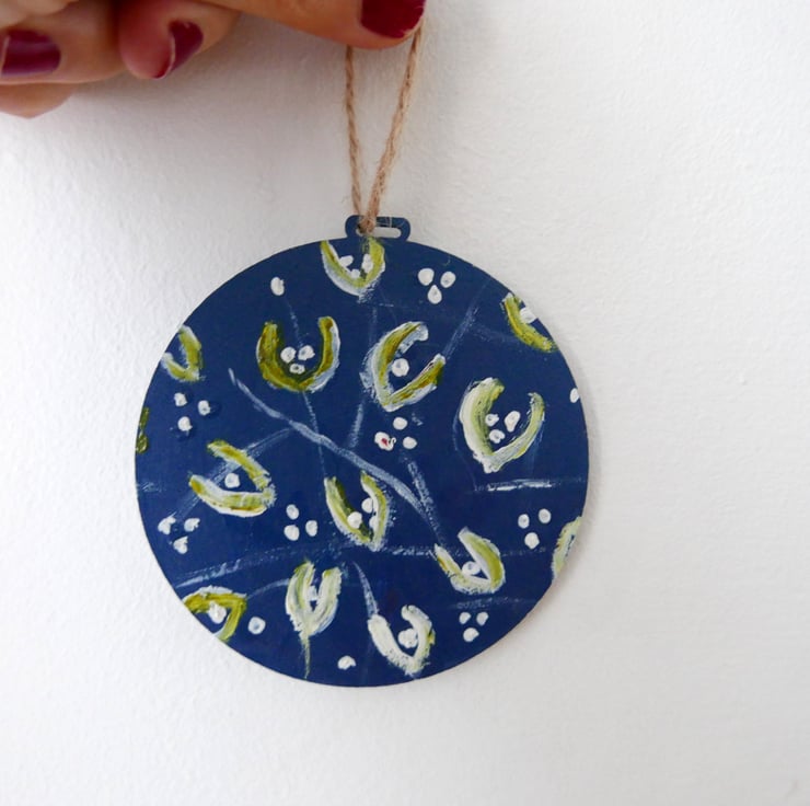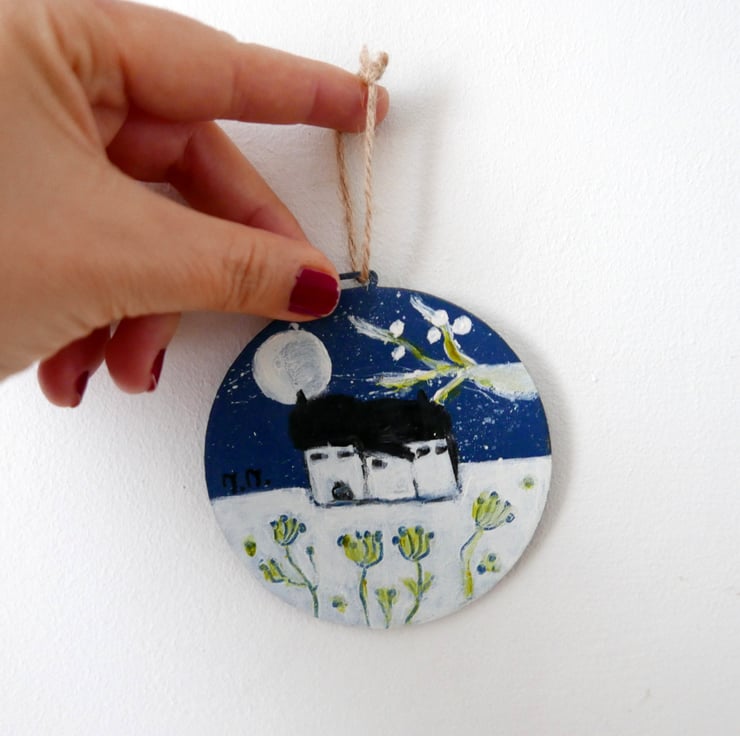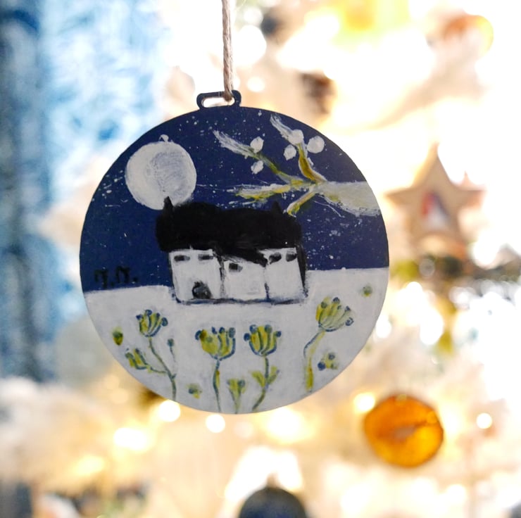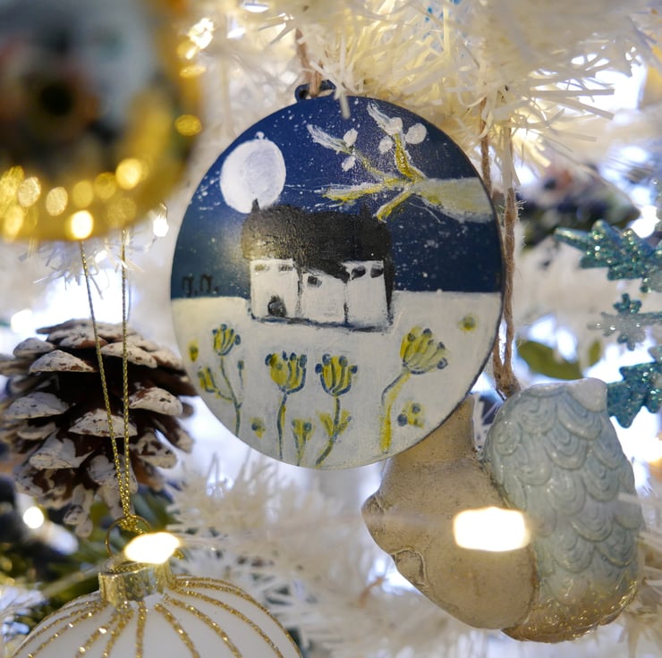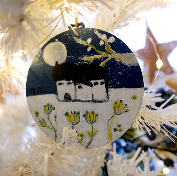 This winter landscape Christmas decoration is hand-painted in acrylic featuring a Devon-inspired cottage against a blue and white background. There is also a tree branch and winter plants, a moon, and snow. The back is also painted with mistletoe brunches. The ornament is approx 3.3" (8.50 cm) and it's round and it has a rustic raffia string for hanging. It is perfect for your handmade plastic-free Christmas.