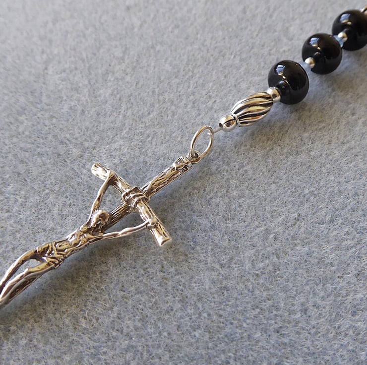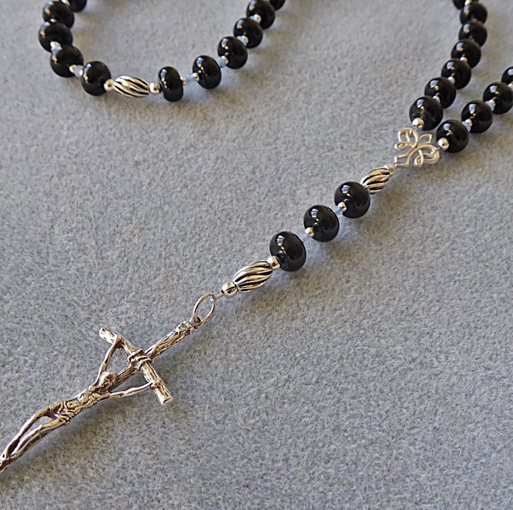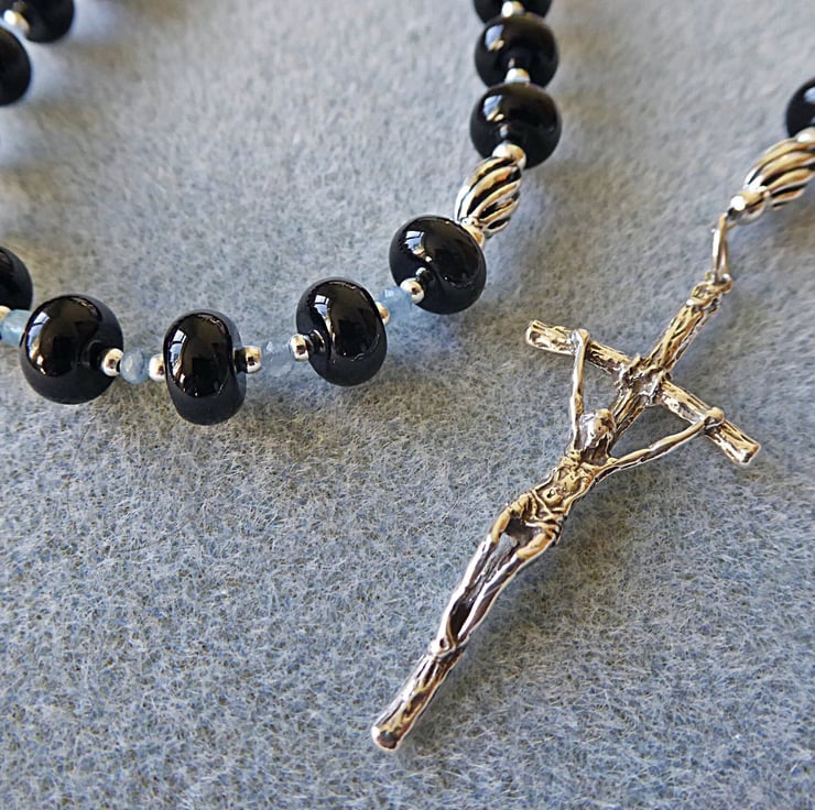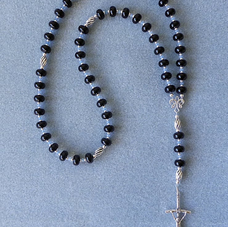 The Our Father/Mystery beads are silver 8mm rice shaped twisted beads with 3mm silver beads either side. 8 x 5mm polished black onyx rondelle beads form the Hail Mary beads/Decades. Between these are 3mm faceted blue agate rondelles with 2mm silver beads.