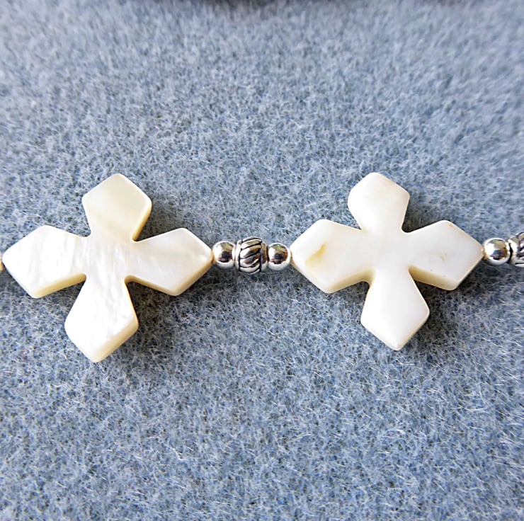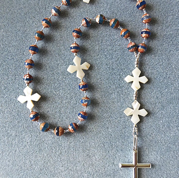 The Invitatory bead and the four Cruciform beads are Mother of Pearl crosses with a 3mm sterling silver bead either side. 8mm round faceted Tibetan agate beads form the weeks. Between the first two Mother of Pearl beads are sterling silver plain and decorative beads.