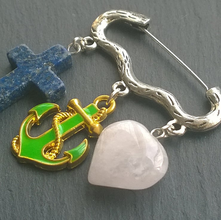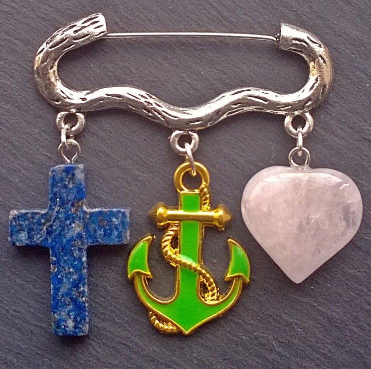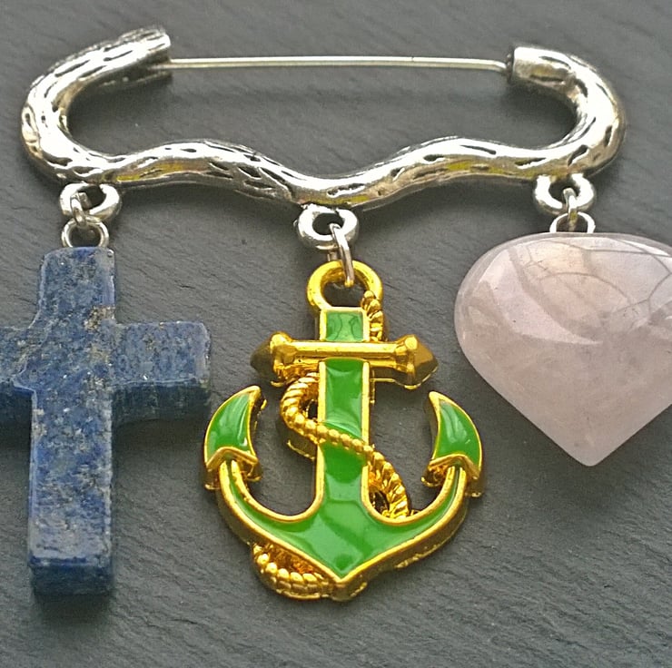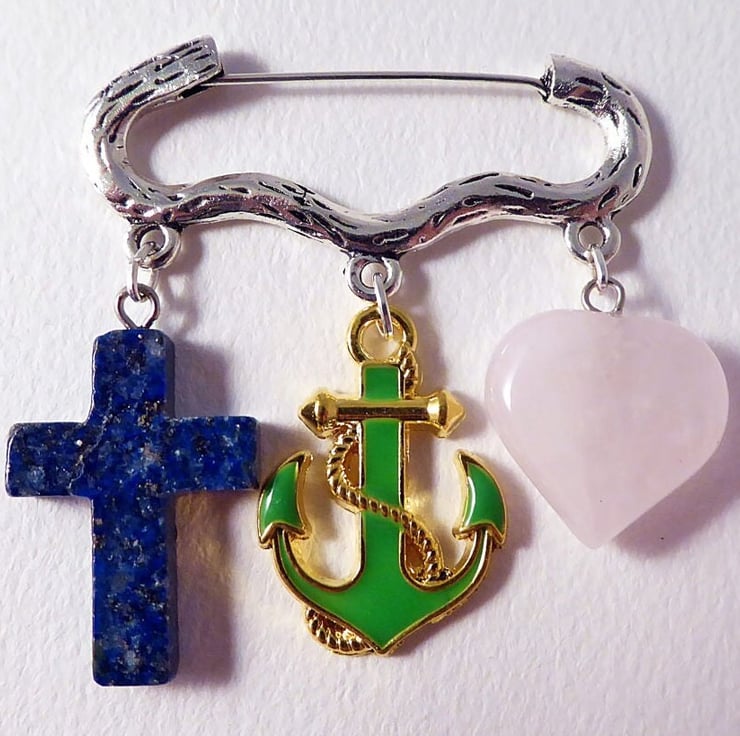 The cross is lapis lazuli, the anchor is green enamelled with gold plated detailing and the heart is a very pale pink rose quartz. The brooch is approximately 4.4 cm across.