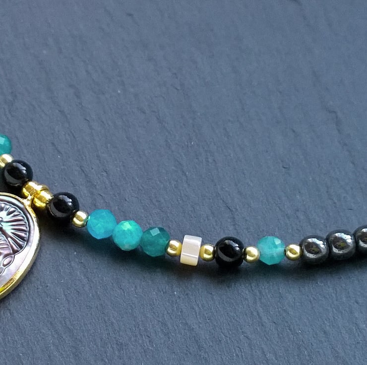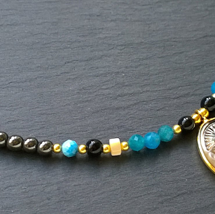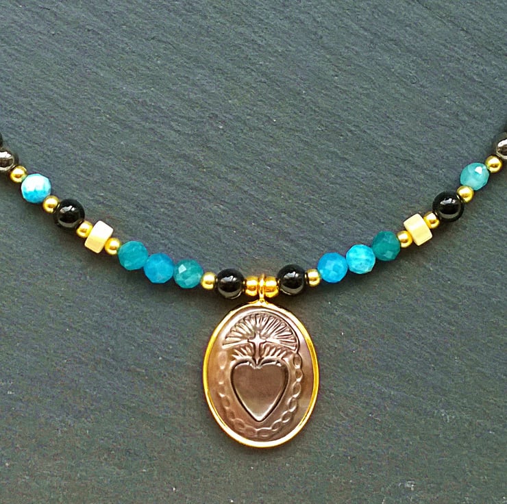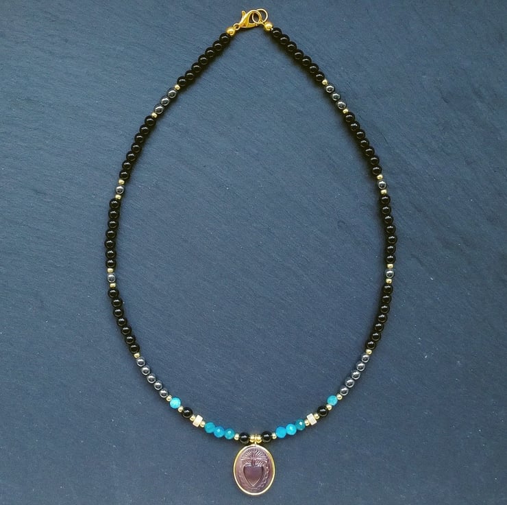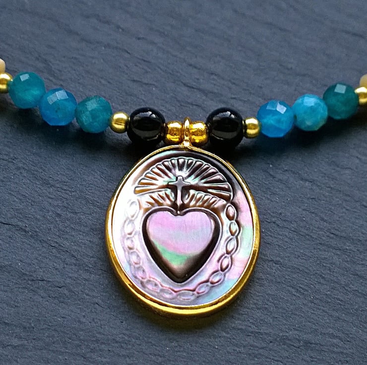 The pendant has unique colouring as it is made from natural shell which has the Sacred Heart of Jesus carved into it, the reverse side is polished shell. The rest of the necklace consists of a balanced pattern of beads, starting from the pendant out these are 4 mm black onyx, 5 mm faceted apatite, 5 mm Mother of Pearl heishi, another 5 mm faceted apatite and then a series of 4mm haematite and black onyx beads, all of these groupings are separated by 2.5 mm gold plated beads.