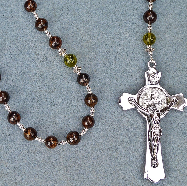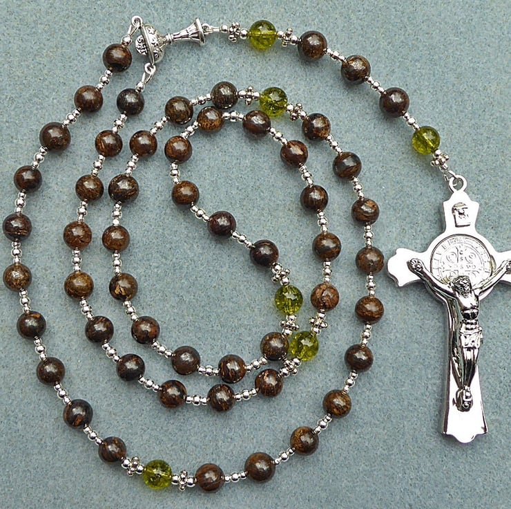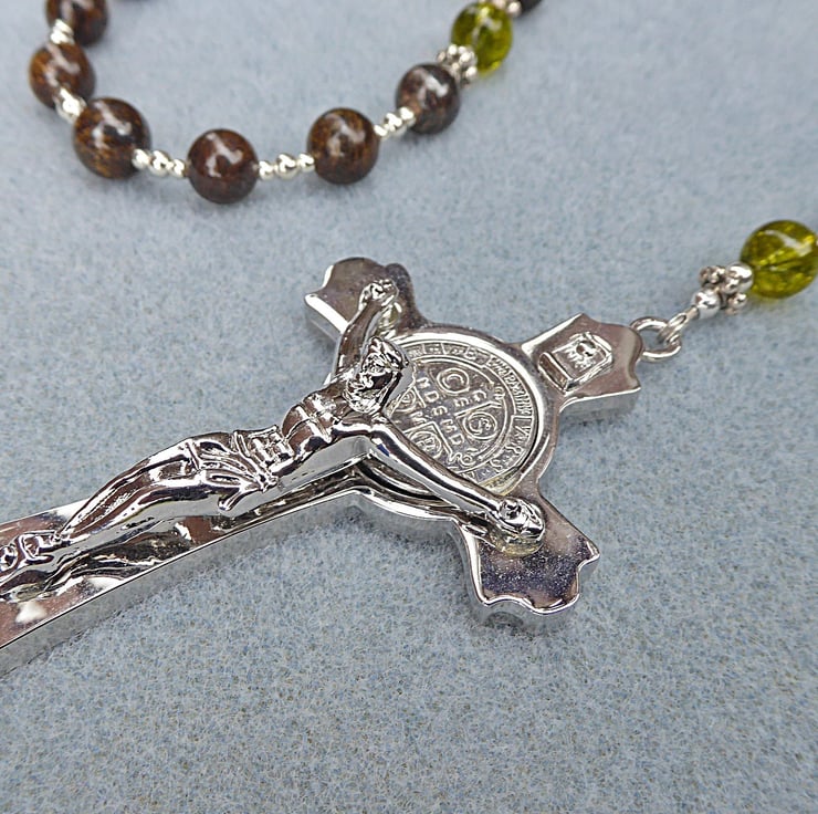 This genuine gemstone five decade Rosary is made from bronzite and peridot beads with a polished zinc alloy crucifix.