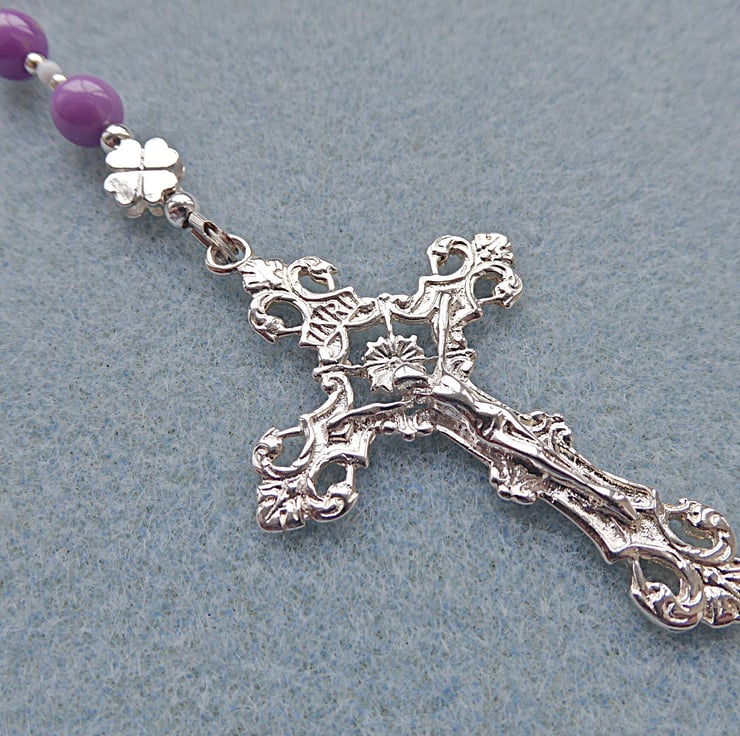 The Our Father/Mystery beads are 8mm four leaved clovers with 3mm silver beads either side. Four leaf clovers have been considered lucky for a very long time, even dating back to the Garden of Eden. Eve is said to have taken a four leaved clover with her to remind her of the lush paradise as they left.
