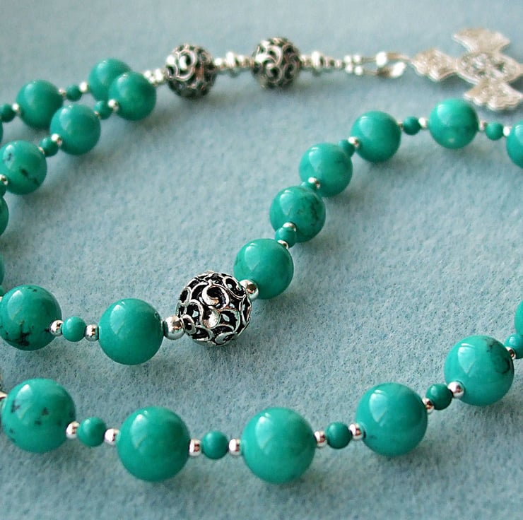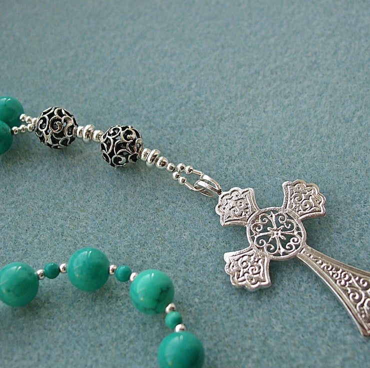 The Invitatory and four Cruciform beads are 925 sterling silver 10mm filigree beads with a 3mm 925 silver bead either side. 8mm turquoise beads form the weeks.