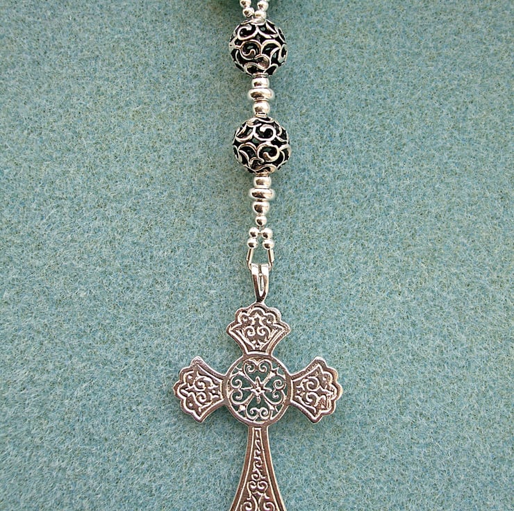 The prayer beads are in a continuous loop and measure approximately 11 inches/28 cm from the base of the Cross to the third Cruciform bead. The pretty cross measures approx 4.5 x 2.7 cm (not including loop).