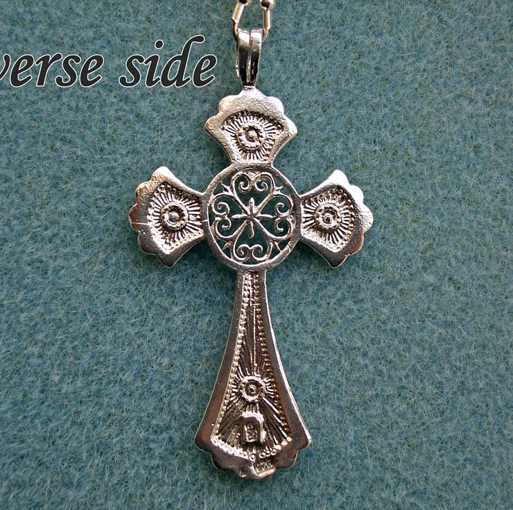 In between the main beads are 3mm turquoise beads with 2mm sterling silver beads. The wire guardian loop just above the cross's bail is silver-filled.