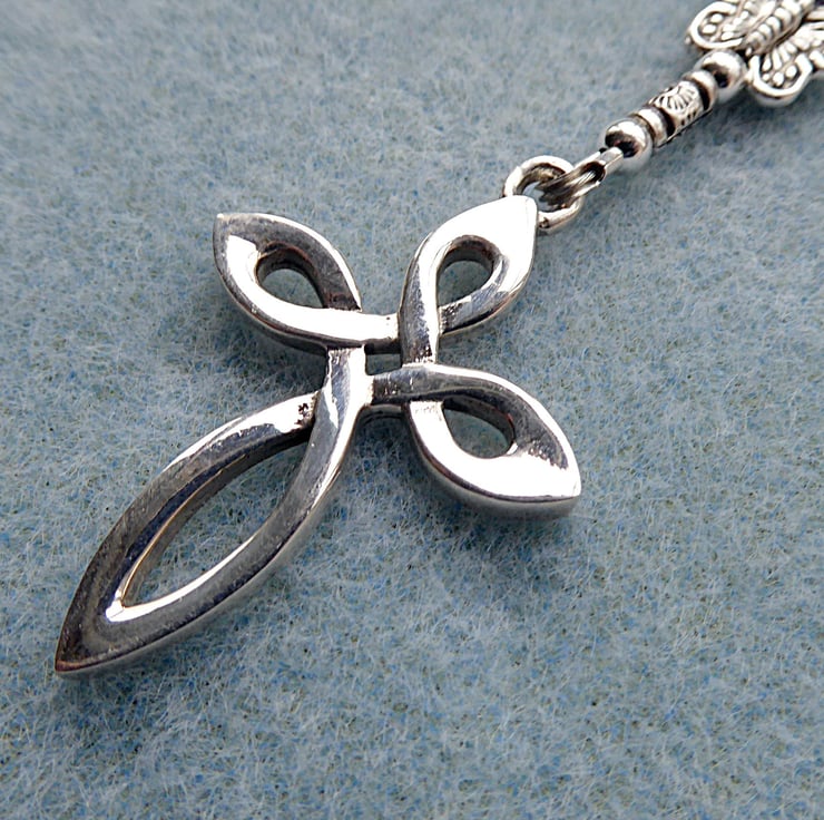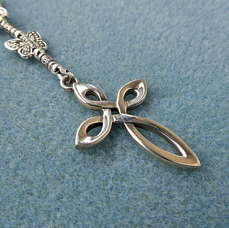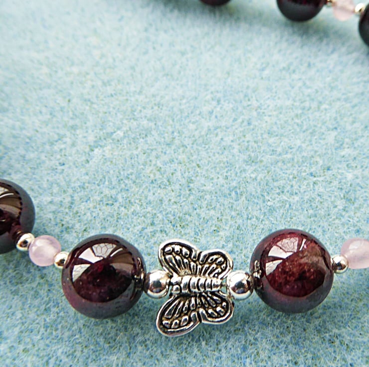 These Anglican Prayer Beads feature a sterling silver cross with dark red garnet, petal pink rose quartz and solid silver butterflies. It is not a necklace and cannot be worn.