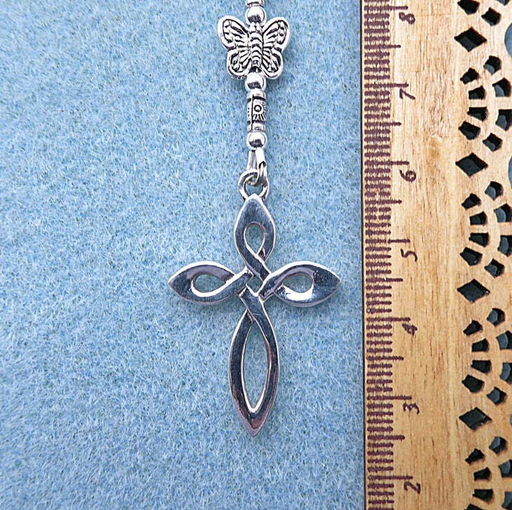 The prayer beads are in a continuous loop and measure approx. 11 inches/28 cm from the base of the Cross to the third Cruciform bead. The cross is stamped 925 on the reverse and measures approx 3.1 x 2.3 cm (not including the loop).