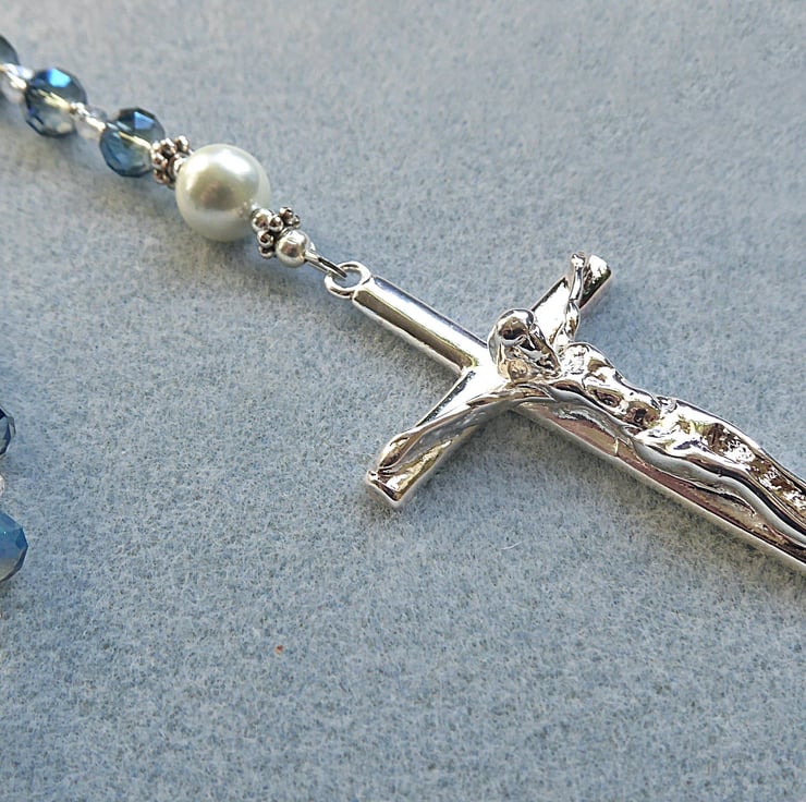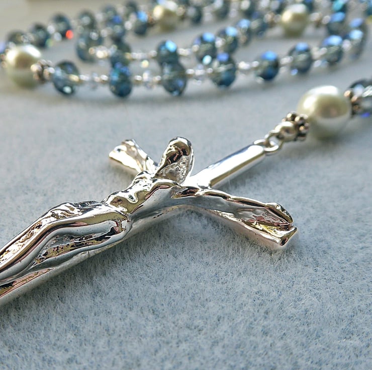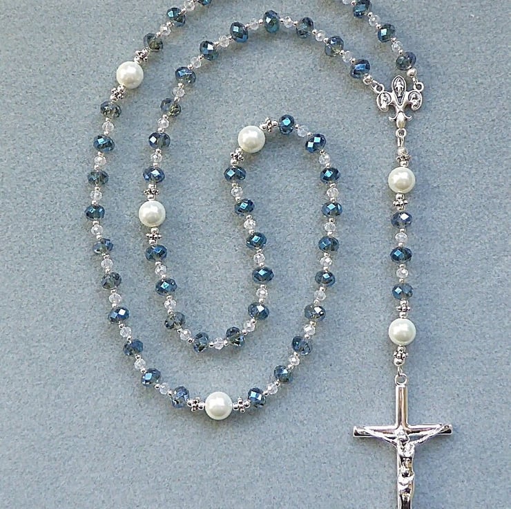 This five decade Rosary is made from blue Czech glass crystal faceted rondelles and shell pearls with a large silver plated crucifix. The soothing visual contrast between the blue crystal and the smoothness of the shell pearls makes it easy to pray with your eyes closed in deep peace and restfulness giving your full attention to the love and praise of your prayers enabling your mind and heart to become quiet.