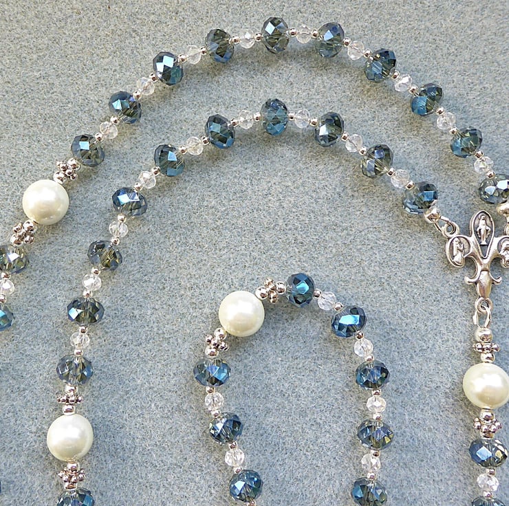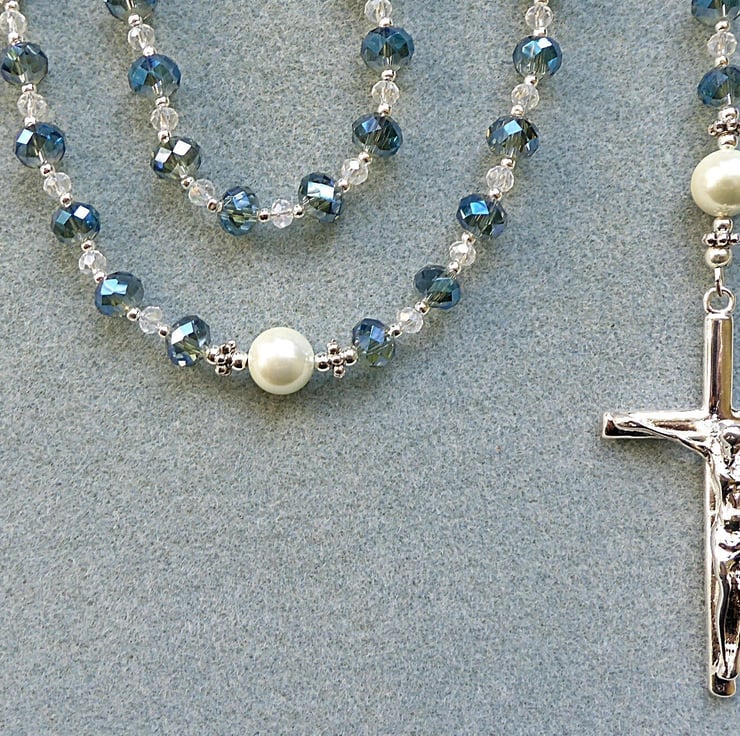 The Our Father/Mystery beads are all made from white 10mm shell pearl beads, created from Mother of Pearl. Each shell pearl is flanked by silver plated beads. 8mm blue Czech glass faceted rondelles with an aurora borealis (AB) coating form the Hail Mary beads/Decades with 2mm silver plated beads and a Czech glass rondelle either side.