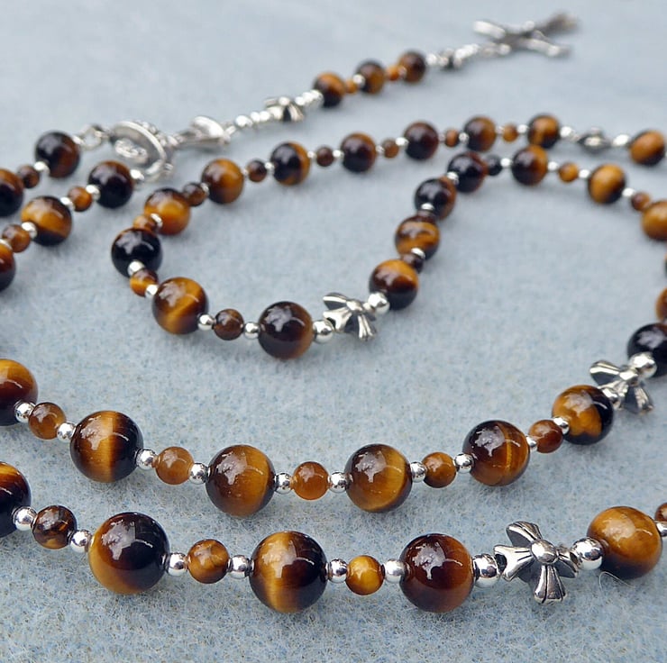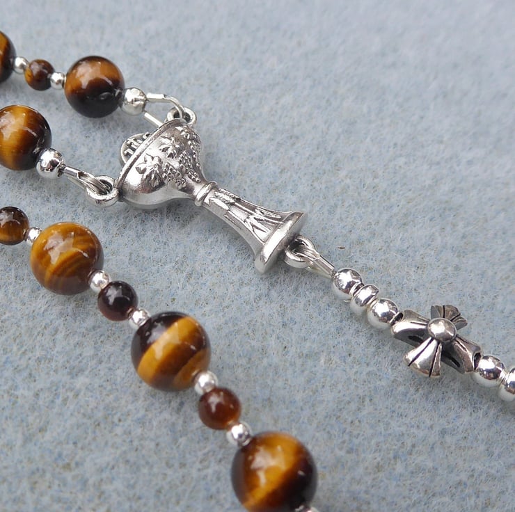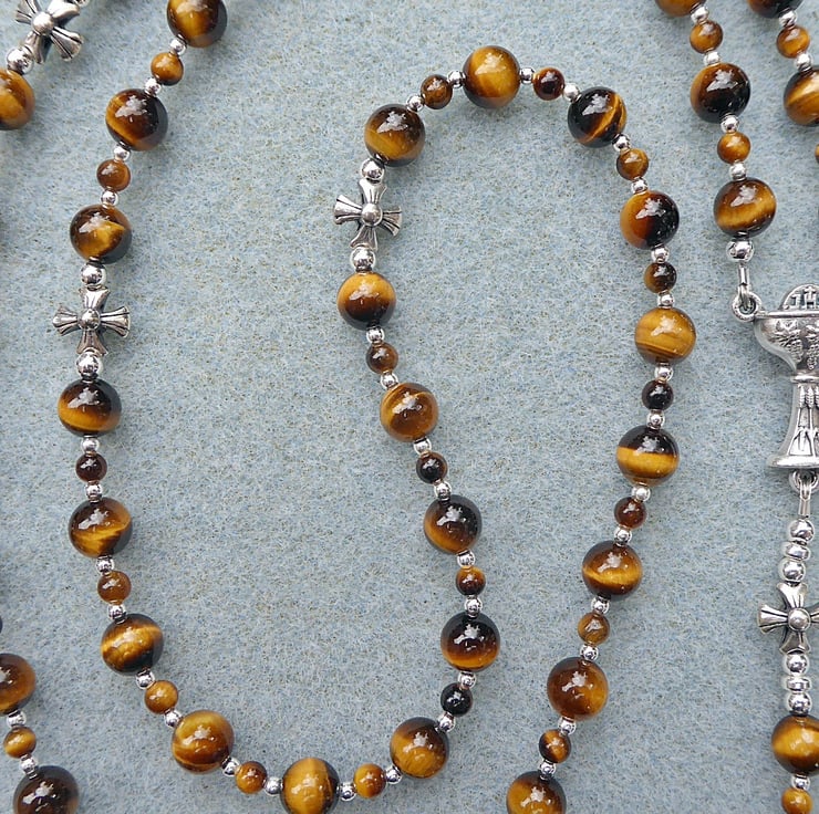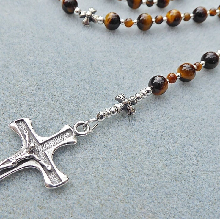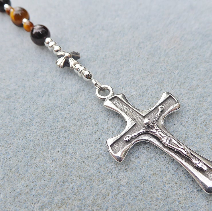 The Our Father/Mystery beads are sterling silver cross beads with 3mm sterling silver beads. 6mm round, faceted and polished Tigers Eye beads form the Hail Mary beads/Decades. Between these are 4mm Tigers Eye beads with 2mm sterling silver beads. All other beads are solid sterling silver.