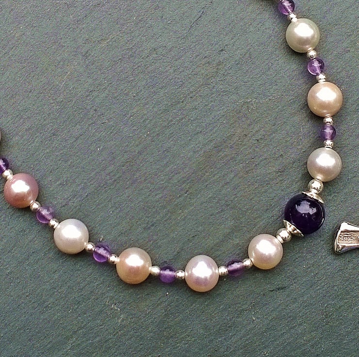 The Our Father/Mystery beads are all 8mm amethyst beads with a silver cap and 3mm silver beads either side. 6.5mm near-round, lilac tint freshwater pearls have been used to form the 'Hail Mary beads/Decades'. Between these are 3mm amethyst beads with 2mm silver beads.