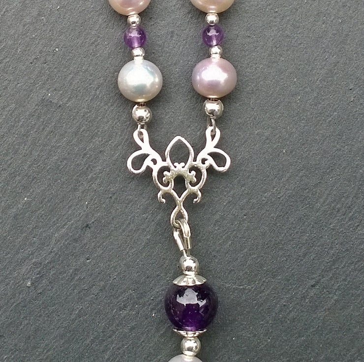 This five decade Rosary is made from AA quality pale lilac sheen freshwater pearls, amethyst and sterling silver. All beads are gems or solid sterling silver.