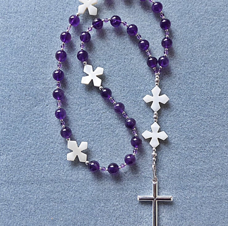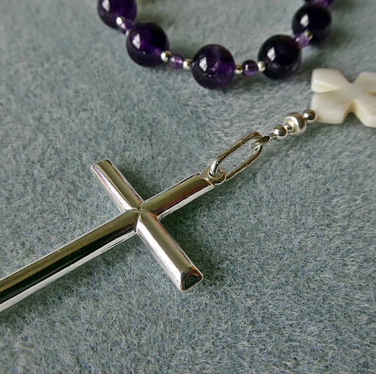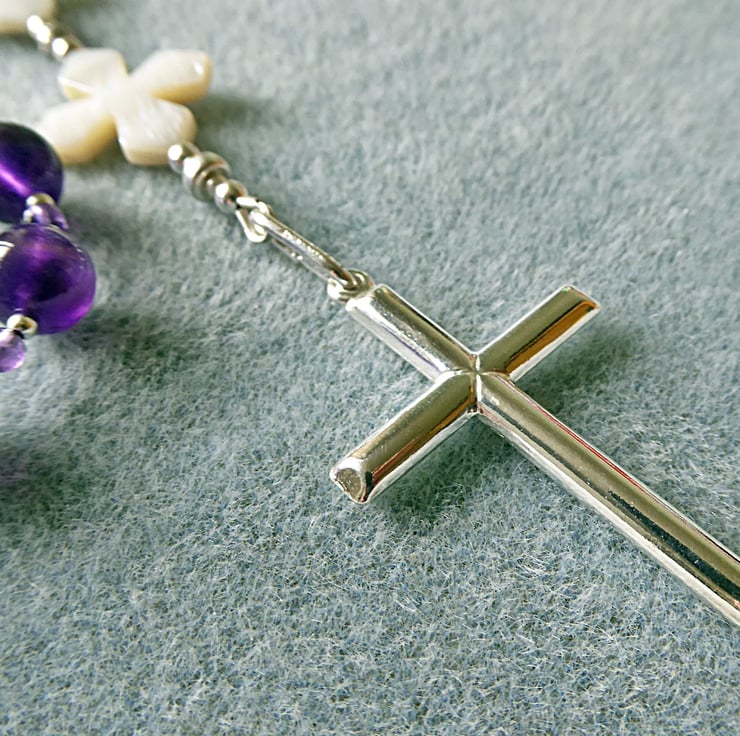 The Invitatory bead and the four Cruciform beads are all mother of pearl hand-cut crosses with a 3mm sterling silver bead at either side. 8mm round, polished amethyst beads form the weeks. Between the first two Mother of Pearl beads are sterling silver plain and decorative beads. The 3mm amethyst beads are flanked by 2mm sterling silver beads. The wire guardian above the cross is silver-filled.