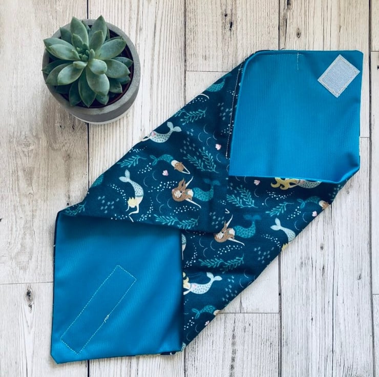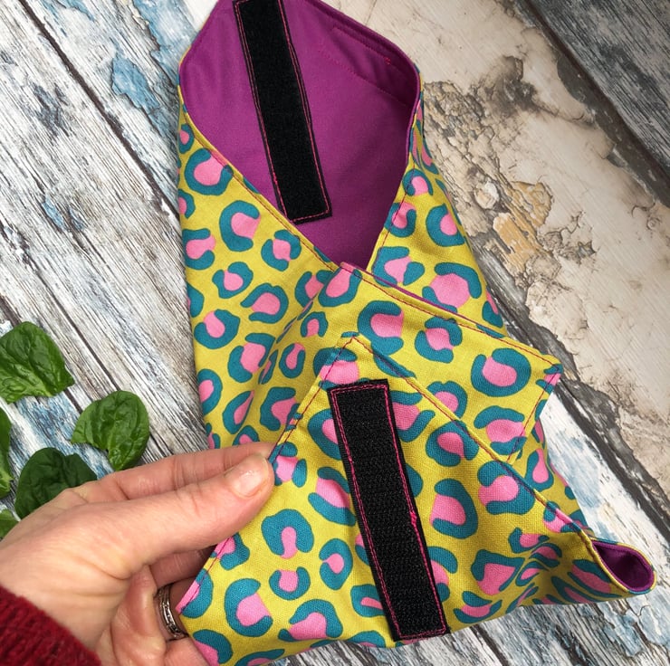 A reusable and washable alternative to clingfilm and foil- wrap your sandwich, bagel, pitta or snack in the fabric wrap and fasten with the velcro tabs.