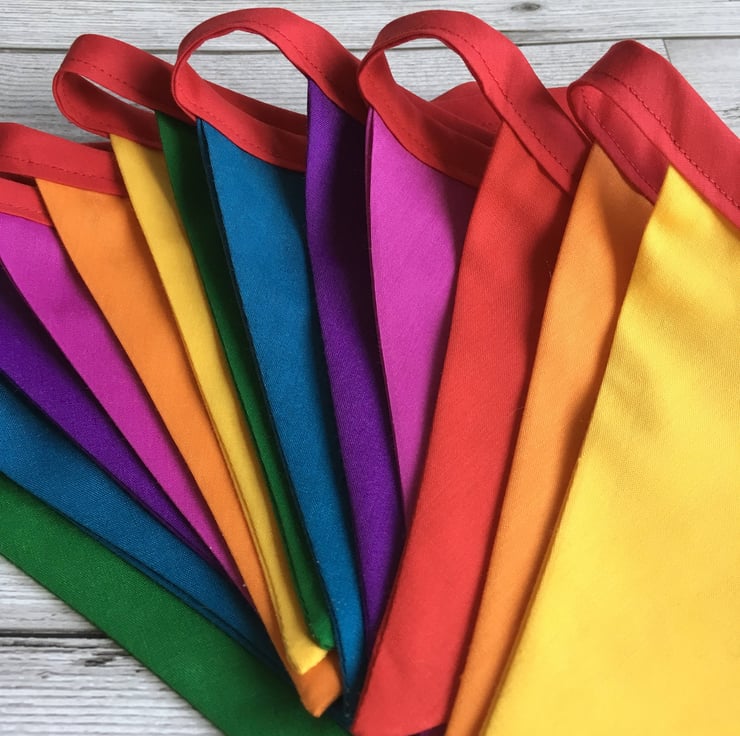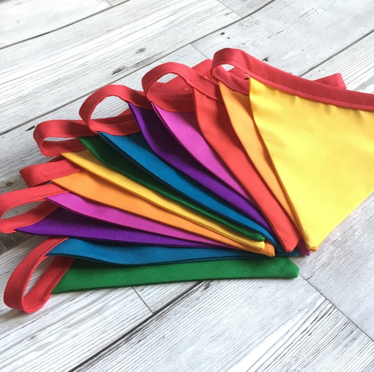 This universal bunting features a rainbow of solid coloured triangular flags along red or navy bias binding. We use the same colours as shown in the listing but occasionally the shades of each colour vary slightly due to natural variations in fabric available.