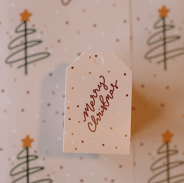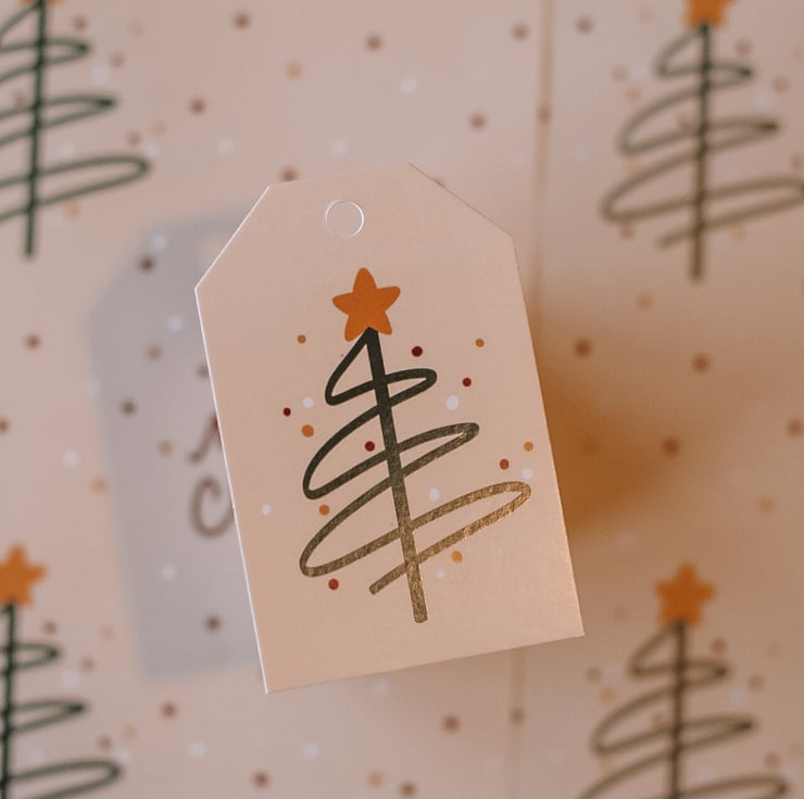 Two standard gift tags with ‘Merry Christmas’ & Christmas tree designs perfect for plain wrapping paper or to match our Thursday’s Child gift wrap & cards.