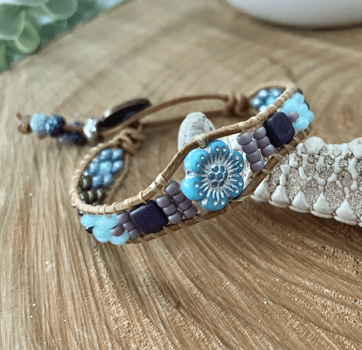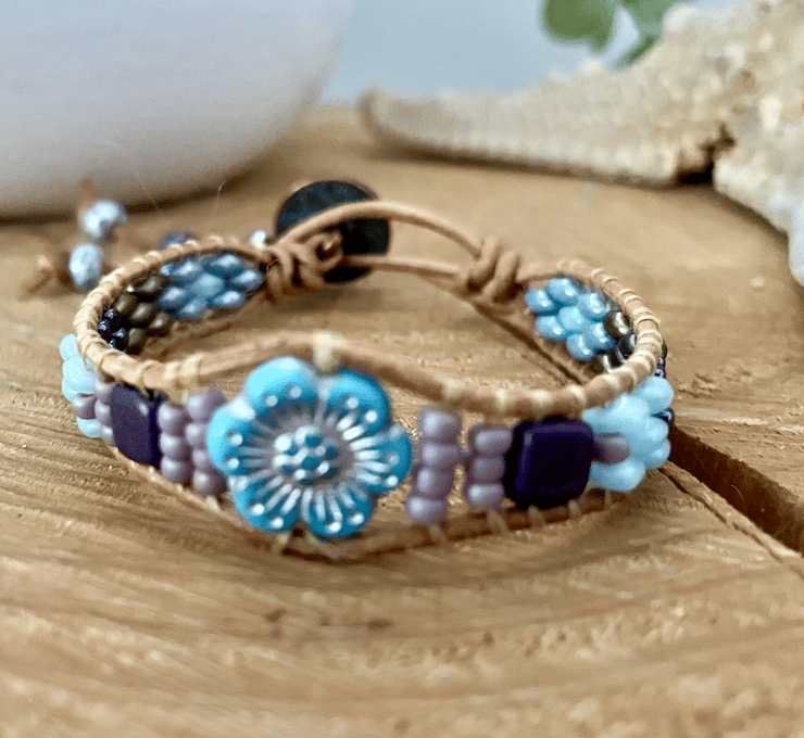 To create this design I have lovingly woven a selection of Czech Super duo, Czech mate tiled beads and tiny seed glass beads onto 1.5 mm soft Italian leather cord. In the centre a Blue Czech Hawaiian flower bead proudly sits. Czech beads are considered to be of the highest quality for durability and depth of color.