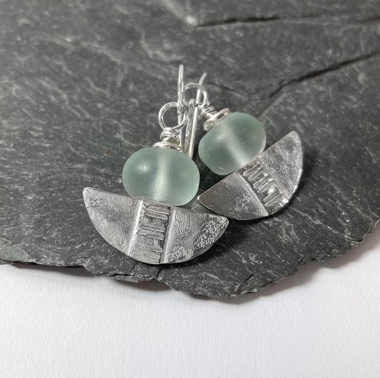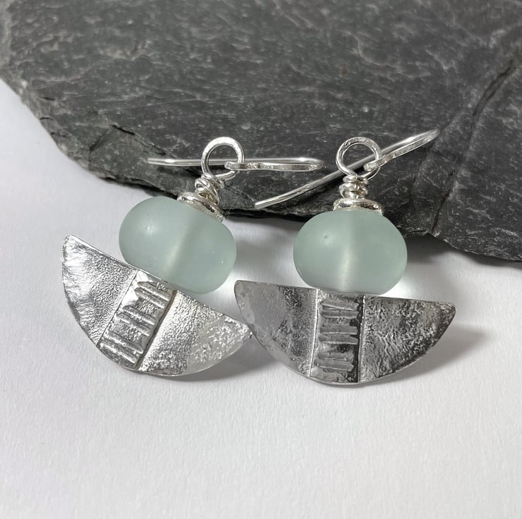 The silver blades have been fused and beaten for texture and a pattern has been punched. These are topped with a plump rondelle of “sea glass”