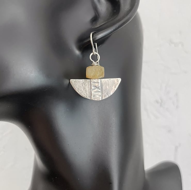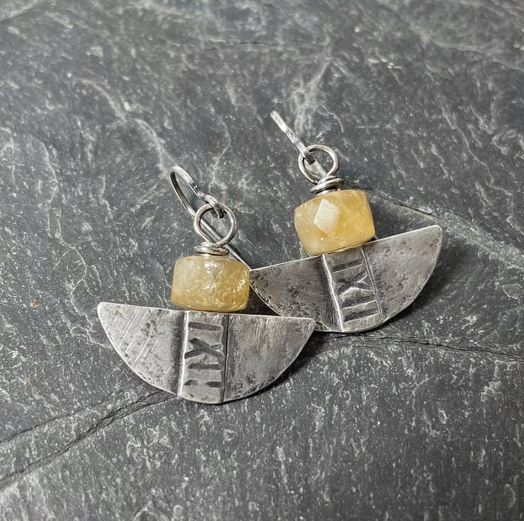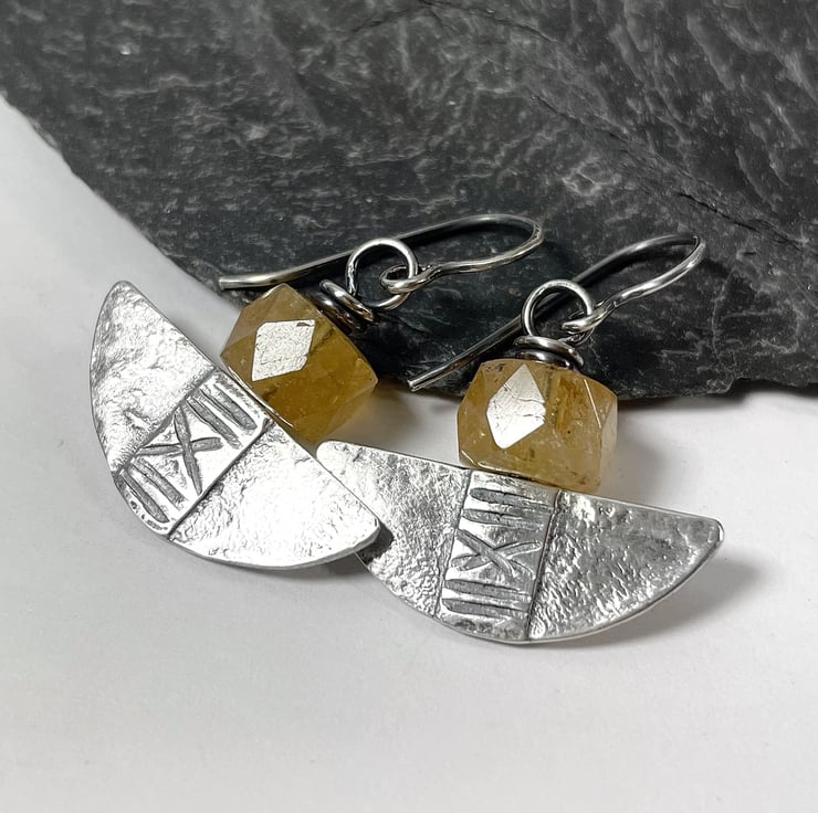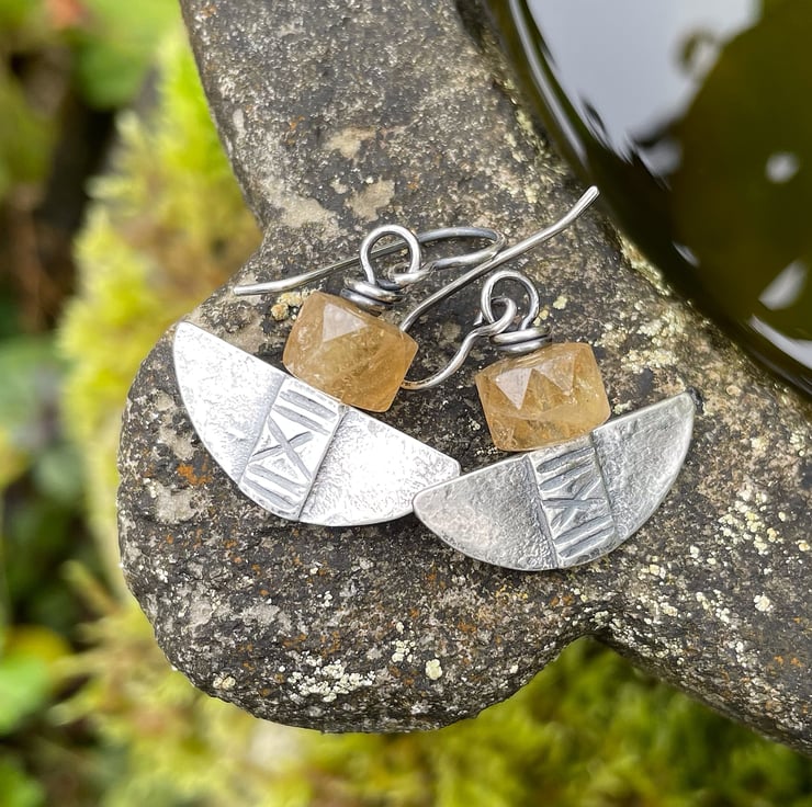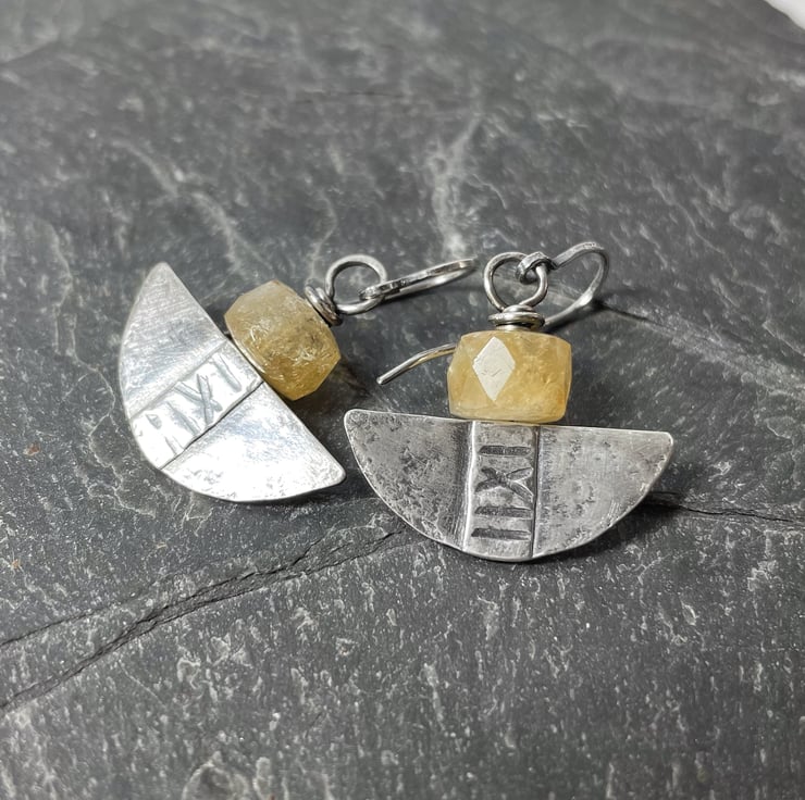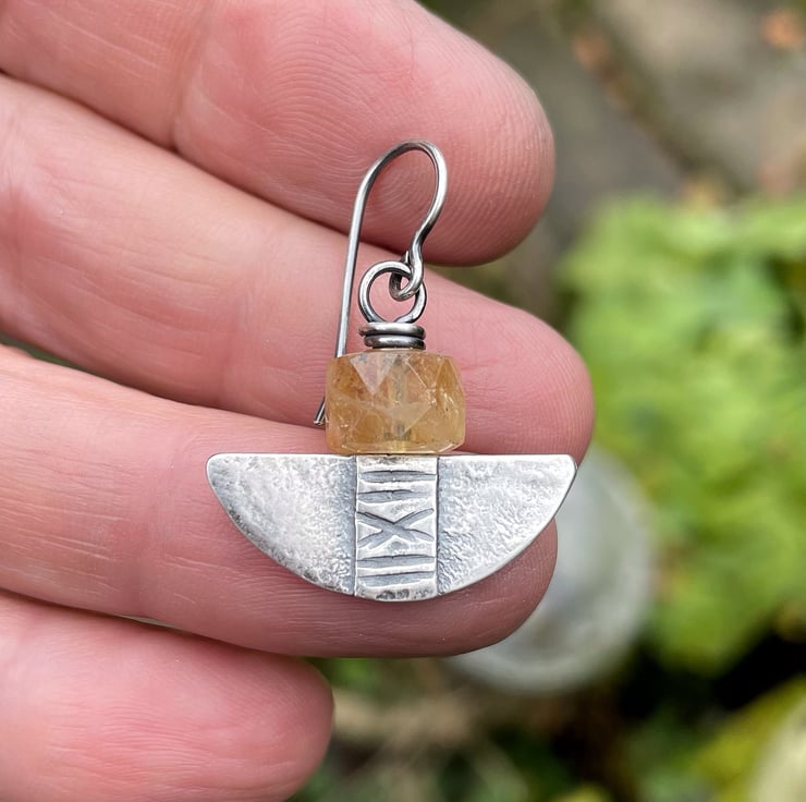 The silver blades have been fused and beaten for texture and a pattern has been punched. These are topped with unusual, faceted citrine beads.