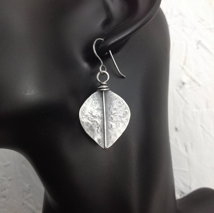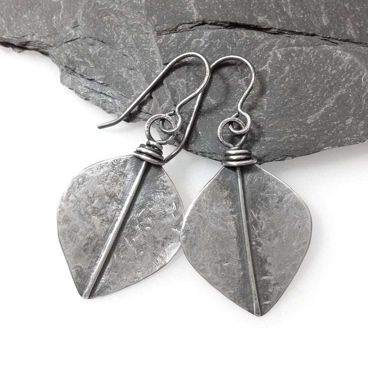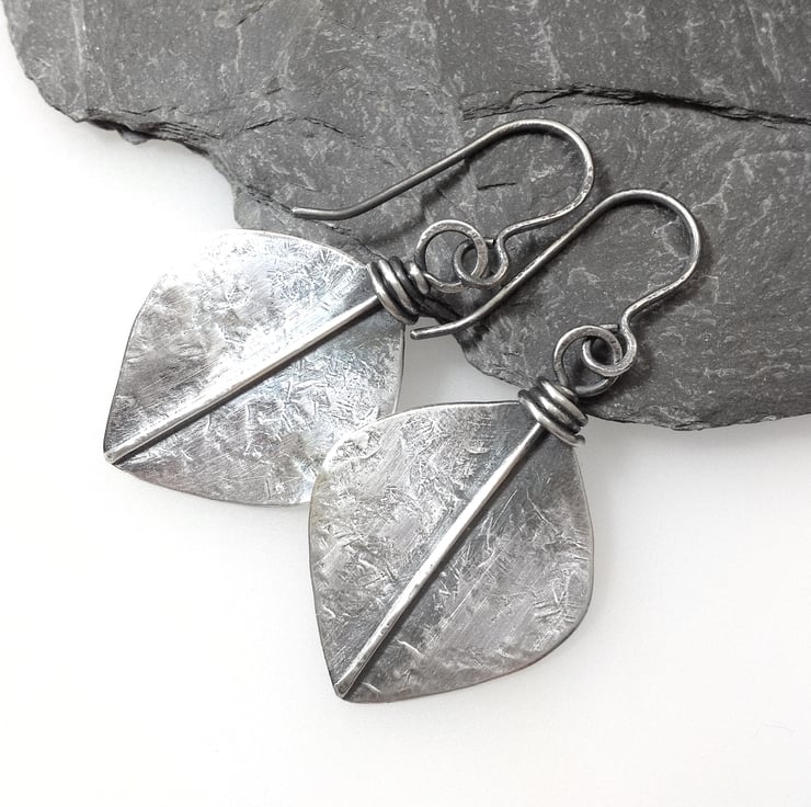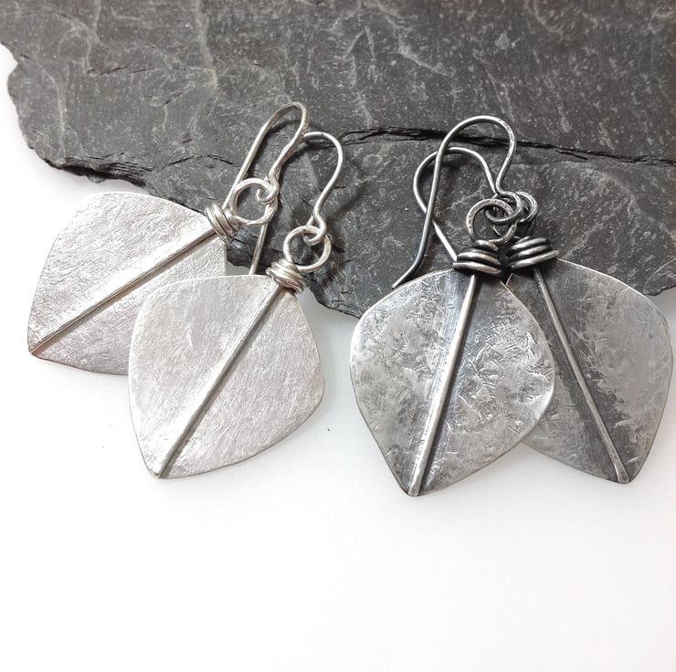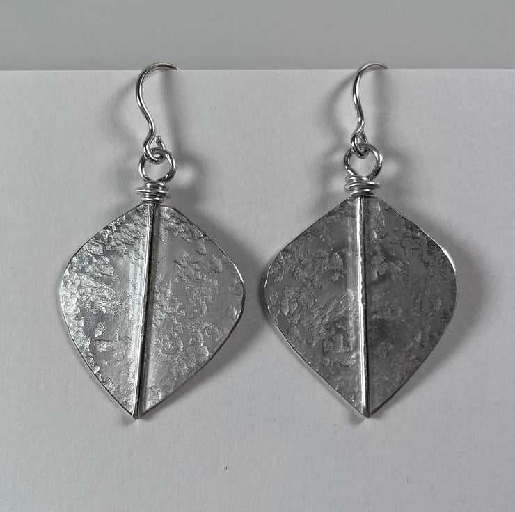 Leafy spear shapes have been cut from silver and beaten for texture, this pair have a bright burnished finish, oxidised are also available..
