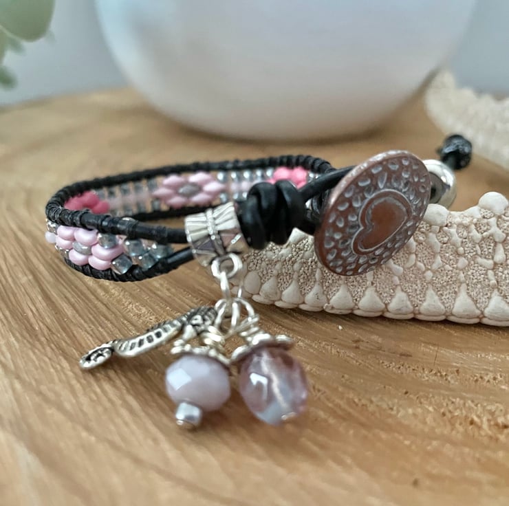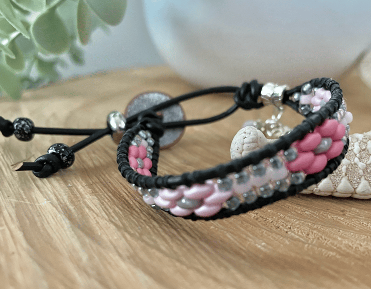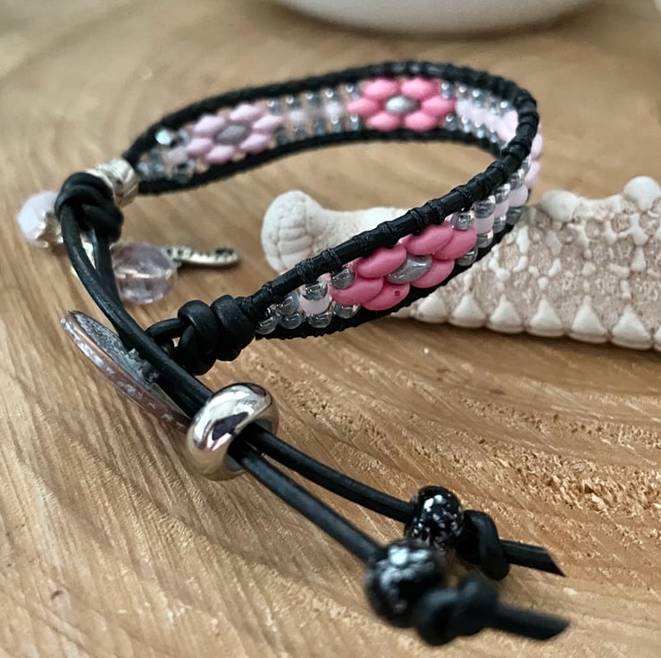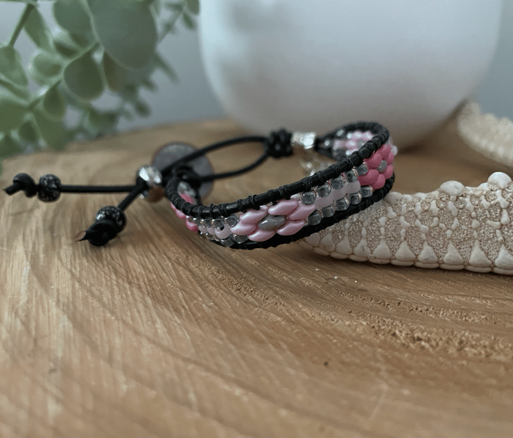 To create this design I have lovingly woven a selection of Czech Super duo, Czech mate tile beads and tiny seed glass beads onto 1.5 mm soft Italian leather cord. The pink colored super duo beads form a diamond pattern and stand out beautifully against a background of grey and pink seed beads.