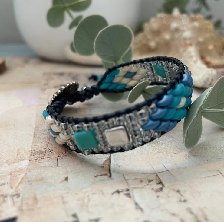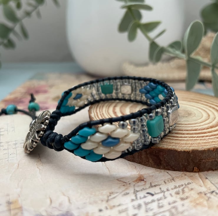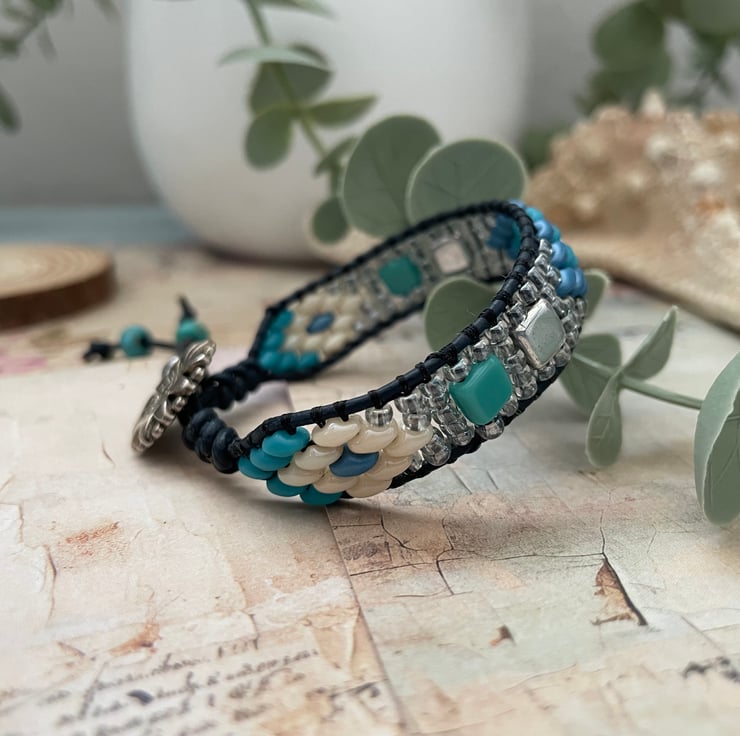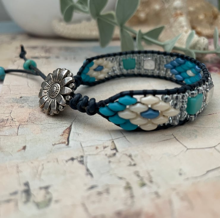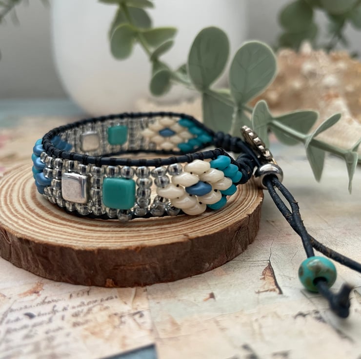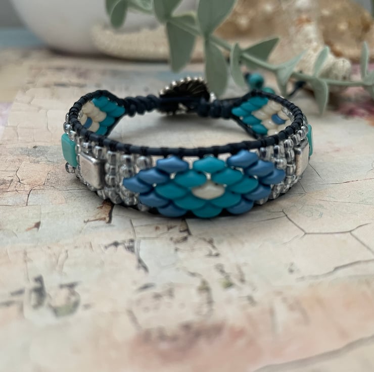 To create this design I have lovingly woven a selection of Czech Super duo, Czech mate tile beads and tiny seed glass beads onto 1.5 mm soft Italian leather cord. The pastel colored super duo beads form a diamond pattern and stand out beautifully against a background of grey seed beads and check mate square beads.