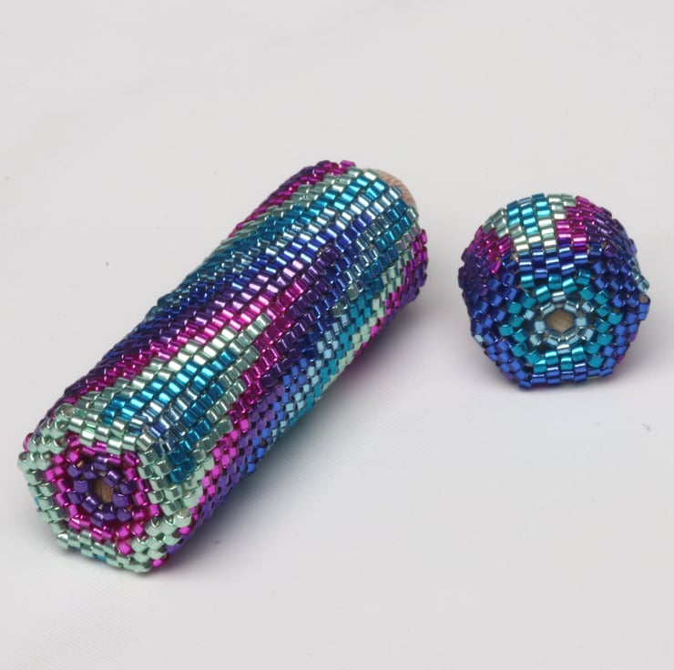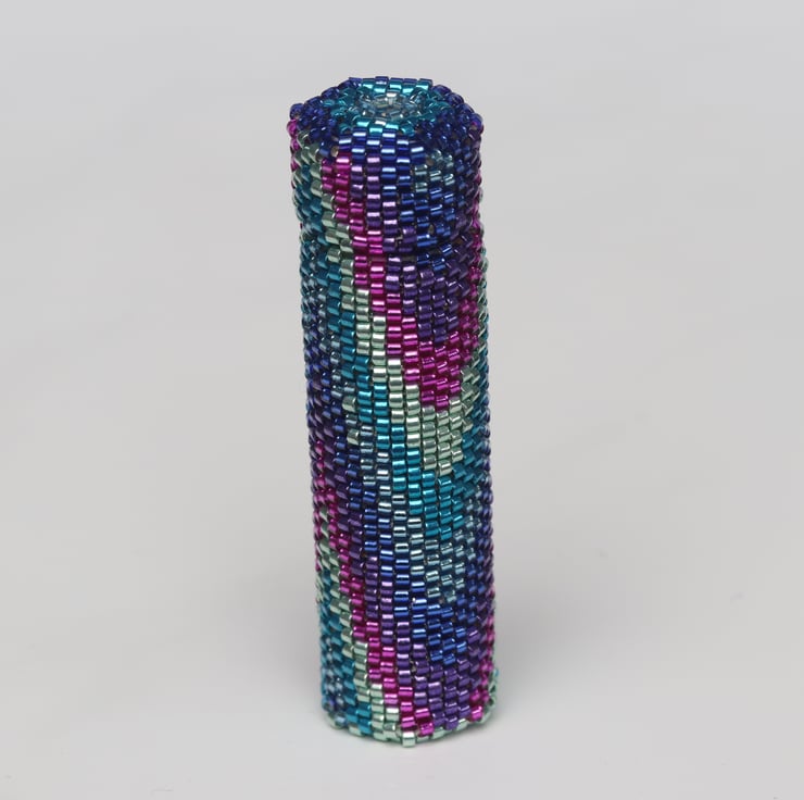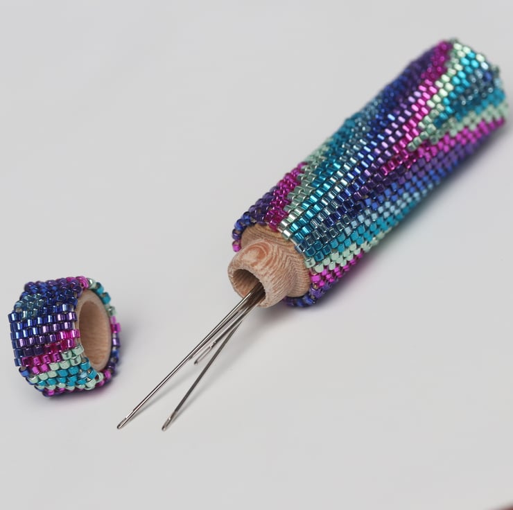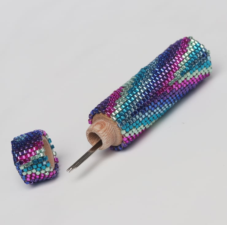 For the needleworker in your life; a neat little tubular wooden case to keep sewing needles all together and to prevent them stabbing you when you are searching through your needlework box. This case has been beaded (both ends and sides) in a vibrant design of purples, greens, teals and blues. I have used glass delica beads (size 11) in a peyote design for the beadwork.