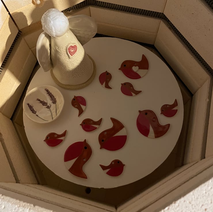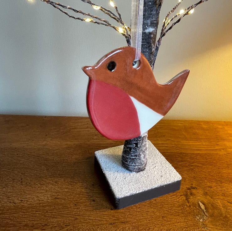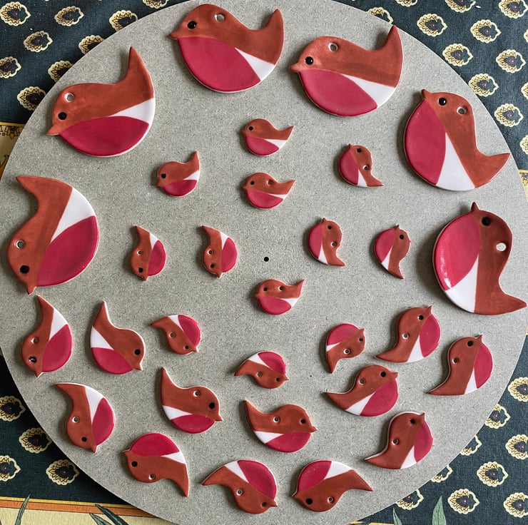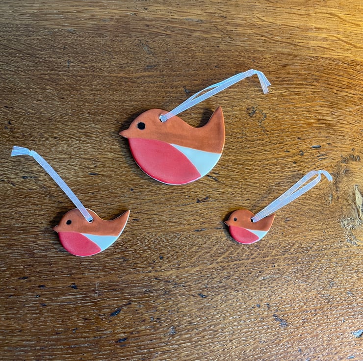 Each robin is made using porcelain clay, once dried they are fired to 1000c known as a bisque firing. Each one is gently sanded and hand painted with 3 coats of underglaze, topped with a shiny transparent glaze. They have been finally fired to 1260c to give them their vibrant colour and sheen.