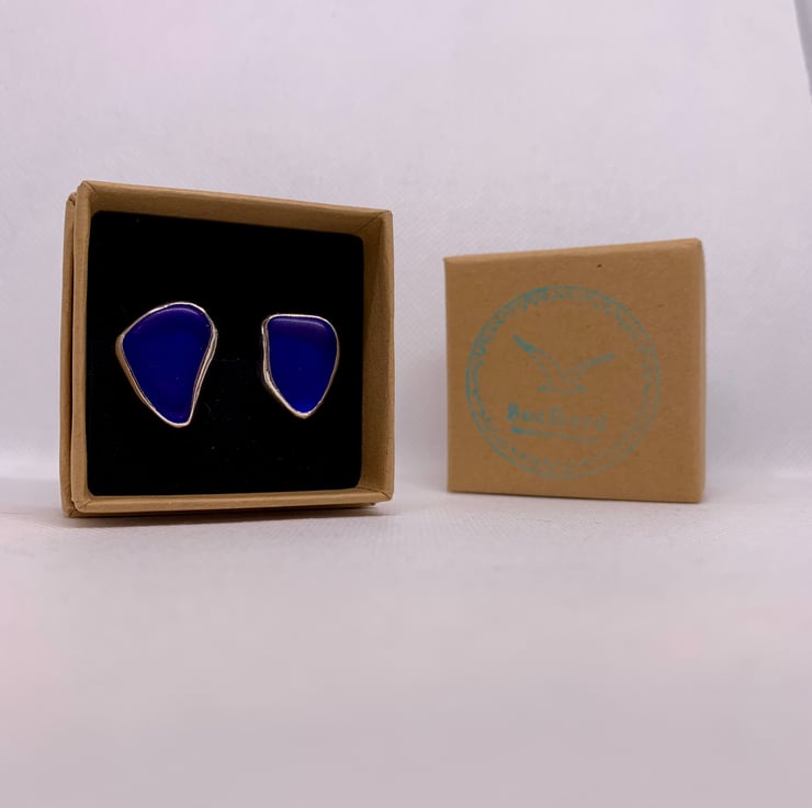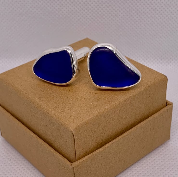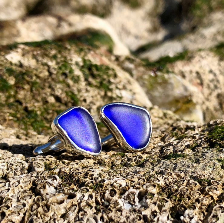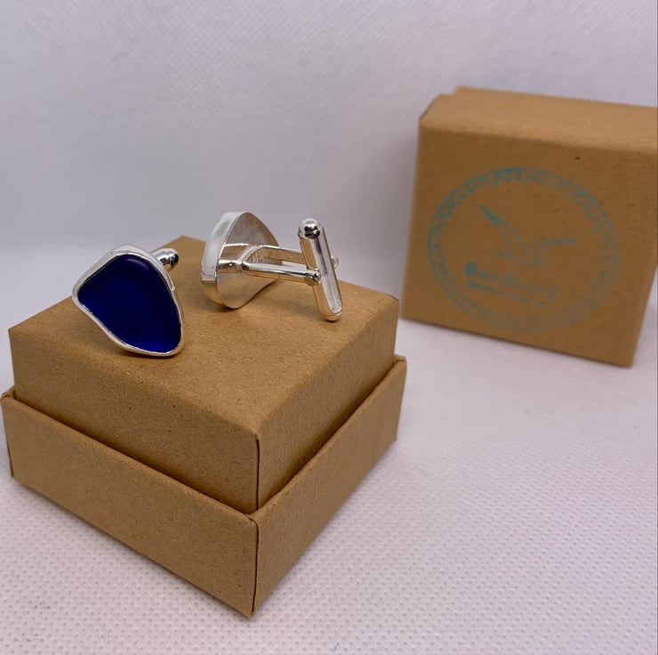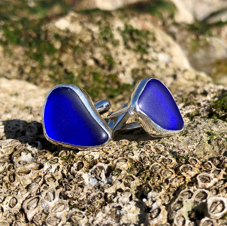 These unique cufflinks have been created using two pieces of stunning cobalt blue sea glass which were found along the UK's South West coastline and has been set in a fine silver bezel (.999) and using sterling silver round bar U arm fittings to create a beautifully unique set of cufflinks. This piece has not been hallmarked.