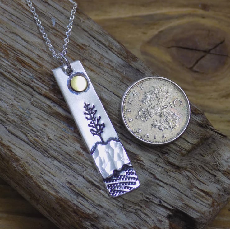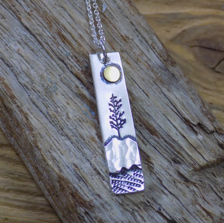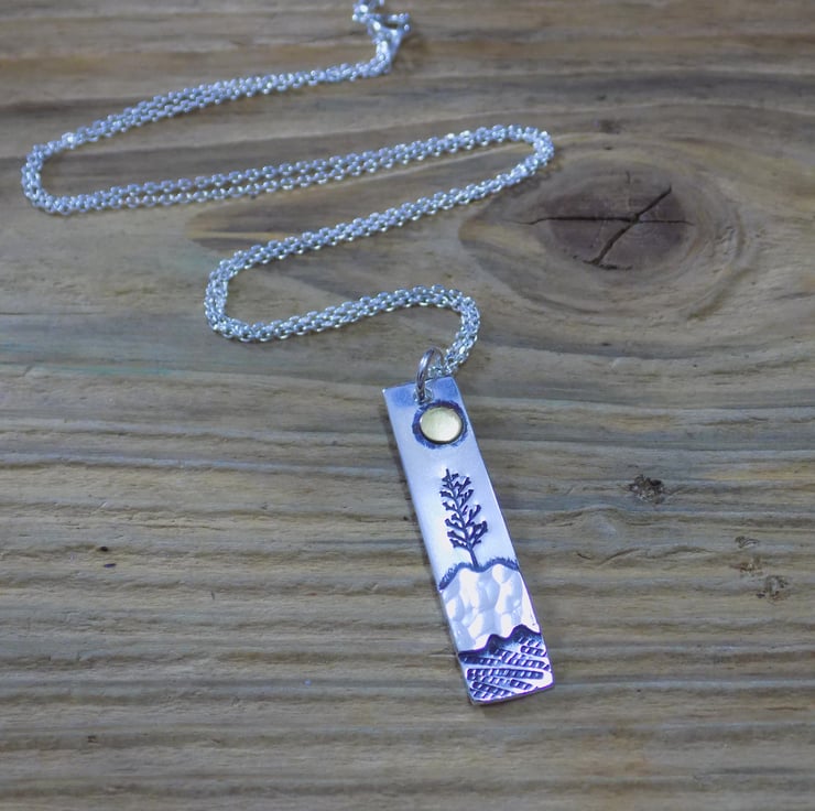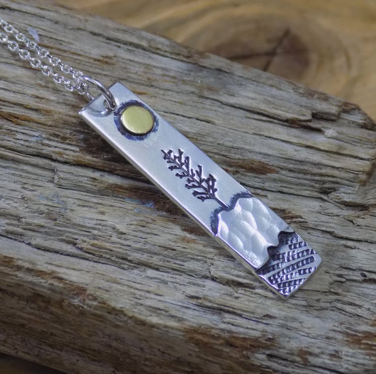 Made from sterling silver and brass. An oblong of silver sheet has been decorated with a single tree and a little silver foreground which has been textured to represent snow. Finished with a brass sun . Suspended on an 18" sterling silver diamond cut trace chain.