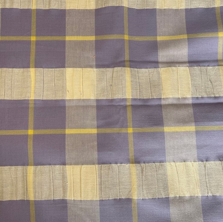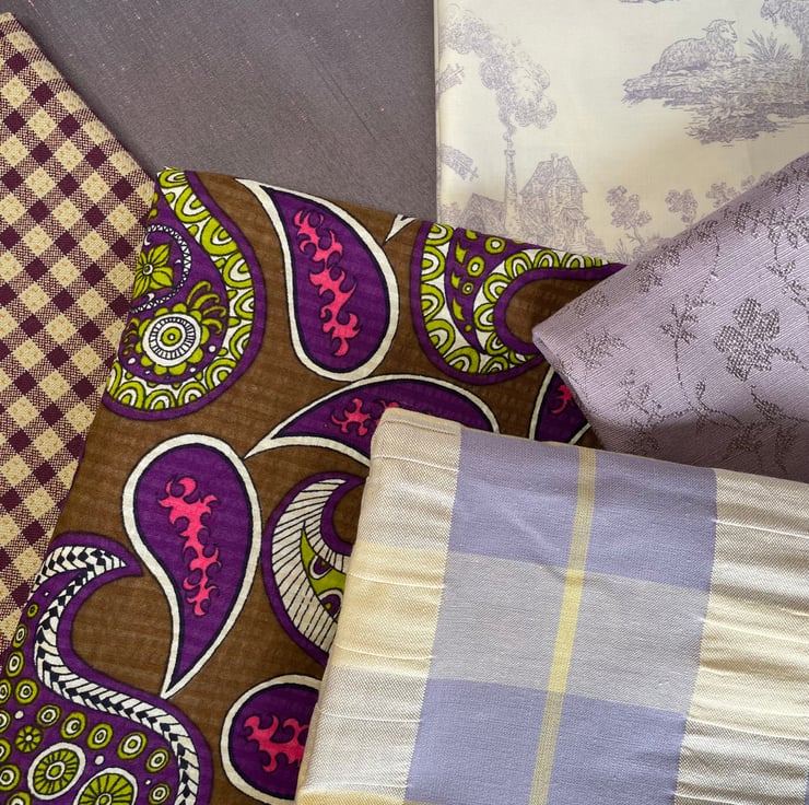 Six beautiful fabrics including a modernist paisley print on a cotton chambray; a mid weight cotton plaid with an interesting ruched element ; a woven floral in mid weight cotton; a light weight cotton print; a mid weight cotton woven check and a piece of shot silk.