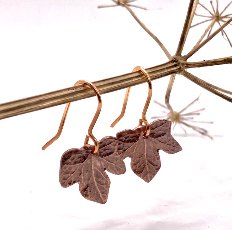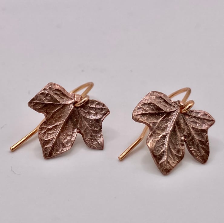 Small Ivy leaf earrings made out of recycled copper precious metal clay. Lovingly handmade and unique, so subtle variation will occur. The earring ear findings are rose gold plated. Earring measure approx 18x15mm.