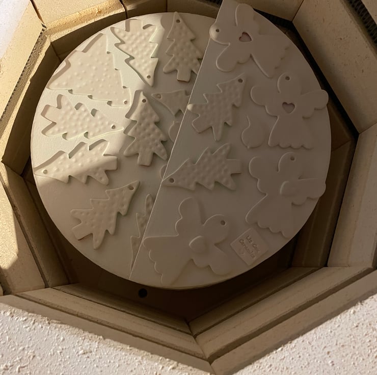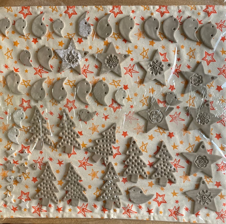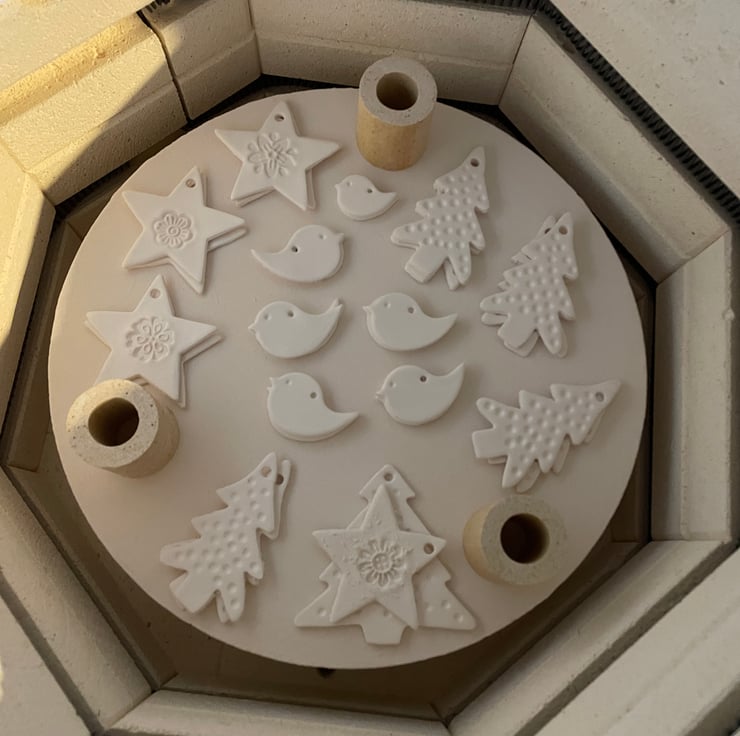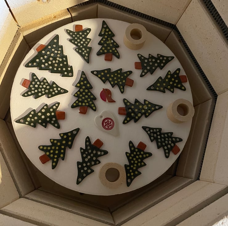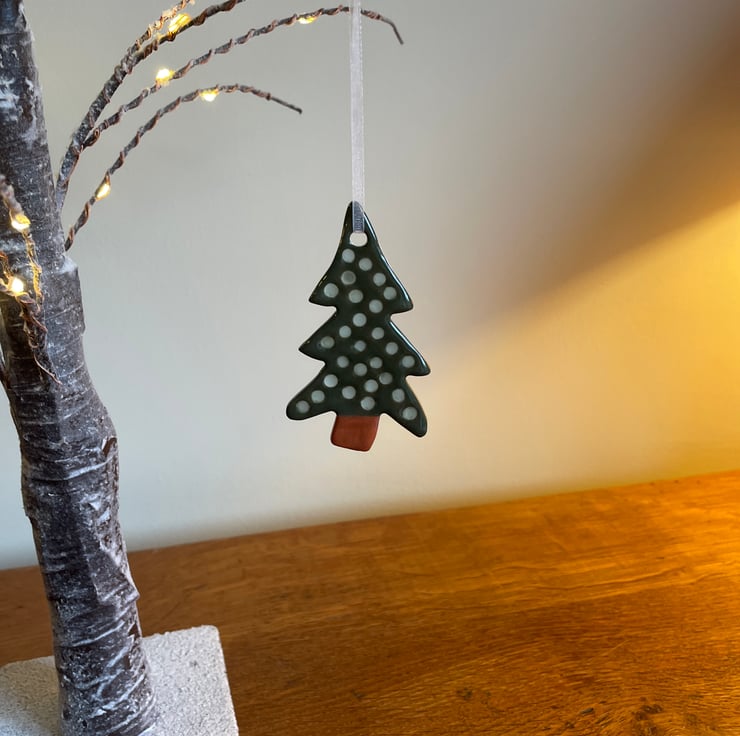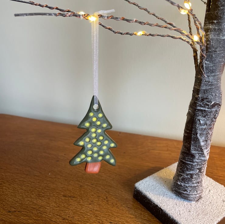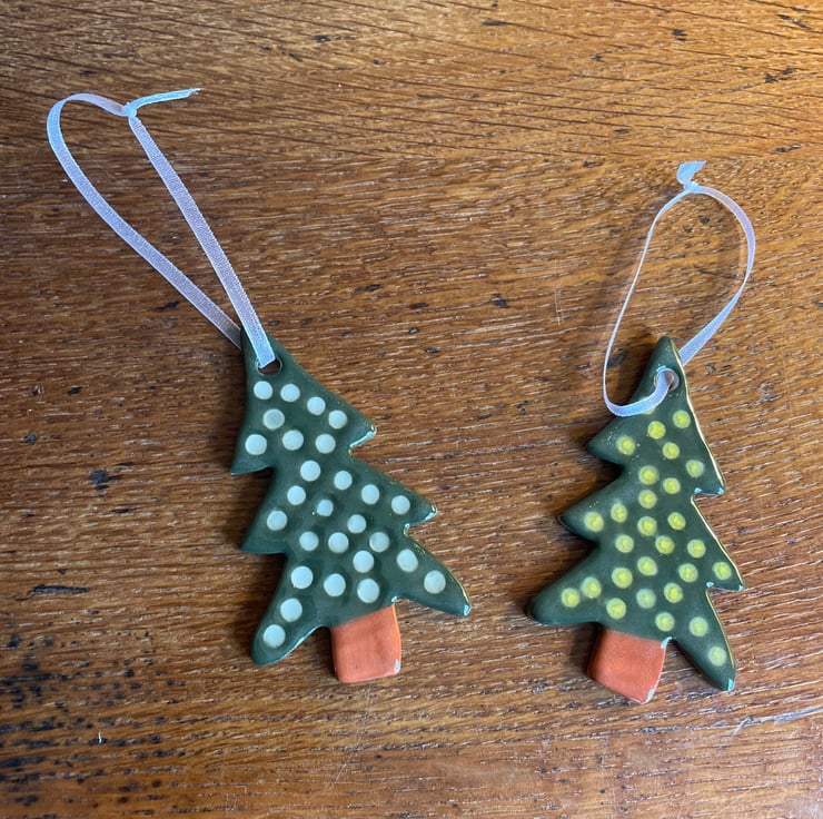 Each Christmas tree is made using porcelain clay, once dried they are fired to 1000c known as a bisque firing. Each one is gently sanded and hand painted with 3 coats of underglaze, topped with a shiny transparent glaze. They have been finally fired to 1260c to give them their vibrant colour and sheen.