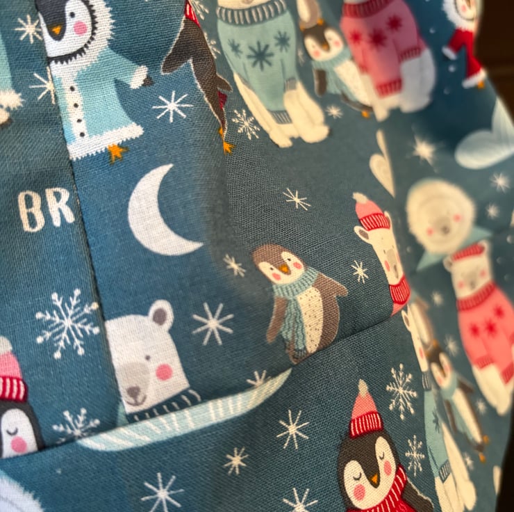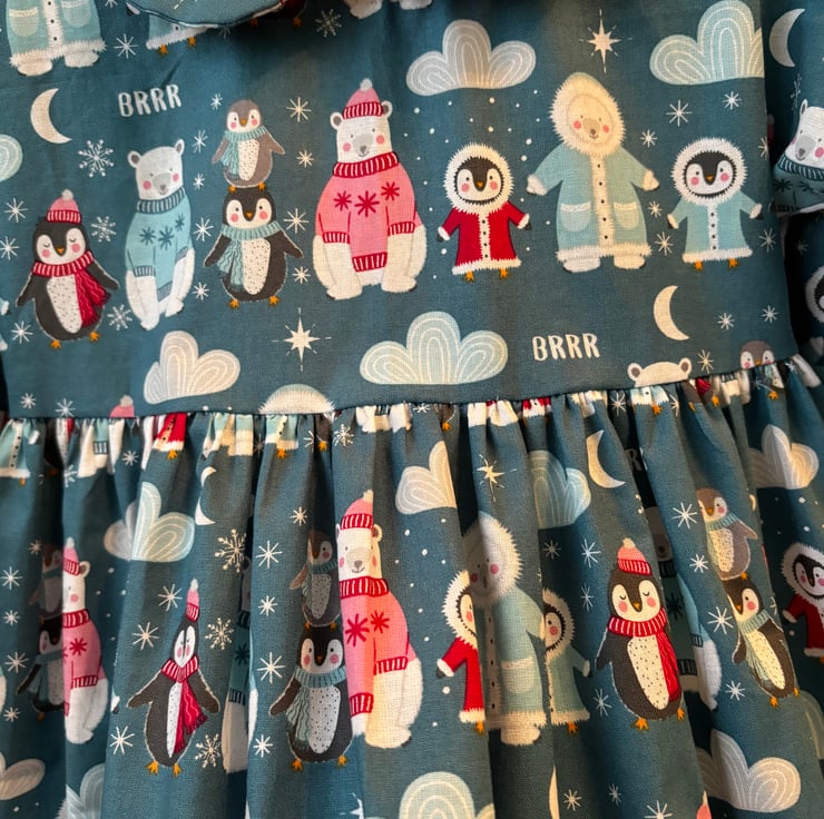 The dress has a Peter pan style collar and I would describe the colour as slate blue. It’s a lovely colour with colourful characters all over. The sleeves and bodice is one piece, so there are no seems around the arm pits.