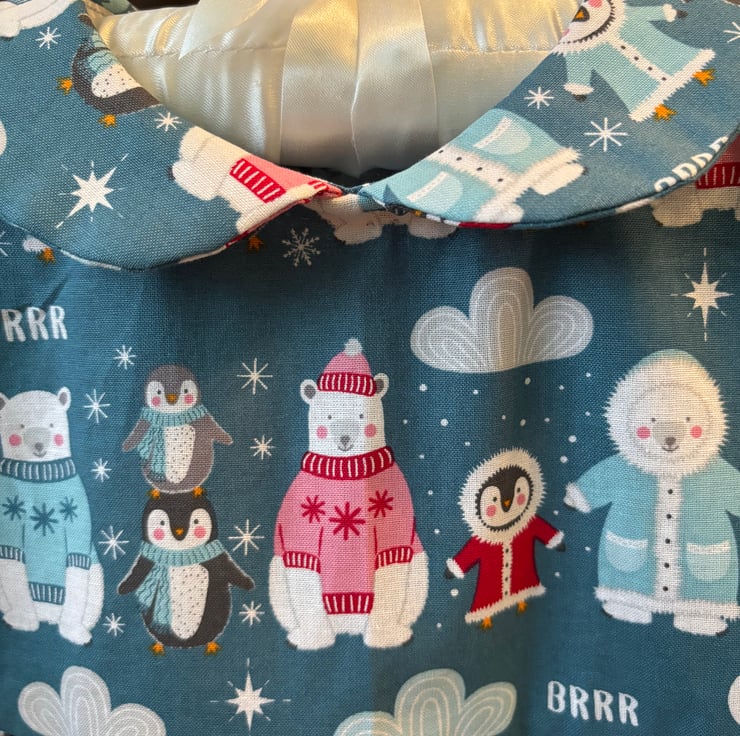This beautiful dress is Winter/ Christmas themed. It is sized for a 1 year old. The length from the back of the neck to the hem line is 58cm/23” the dress measures around the chest 64cm/25”. That is the dress measurement not the chest measurement of the baby.