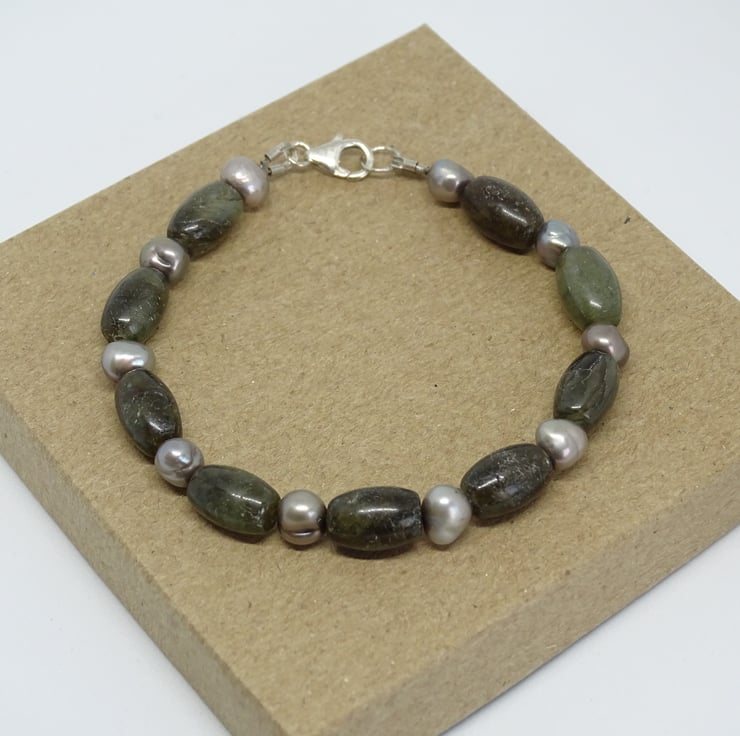 This bracelet is made with Labradorite barrels interspersed with Metallic Lavender Pearls and secured with a sterling silver lobster clasp fastening.