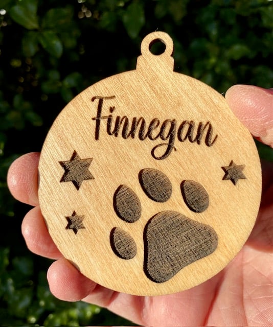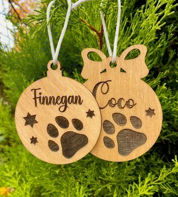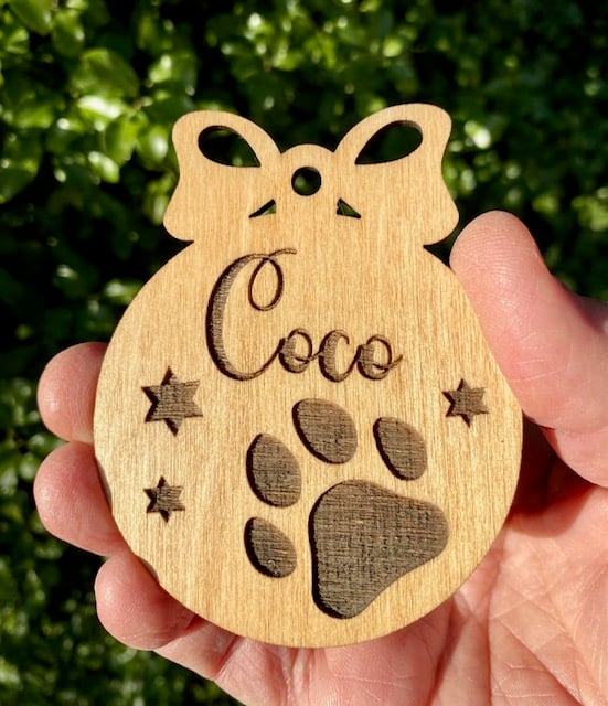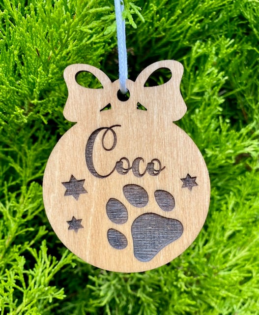 Personalisation included in this beautifully cut and engraved Teak stained Paw Bauble. Something personal for the special members of your family. Each bauble will be supplied with string as you see in the picture. Price includes engraving up to 9 letters. Choose between the bow or plain shape.