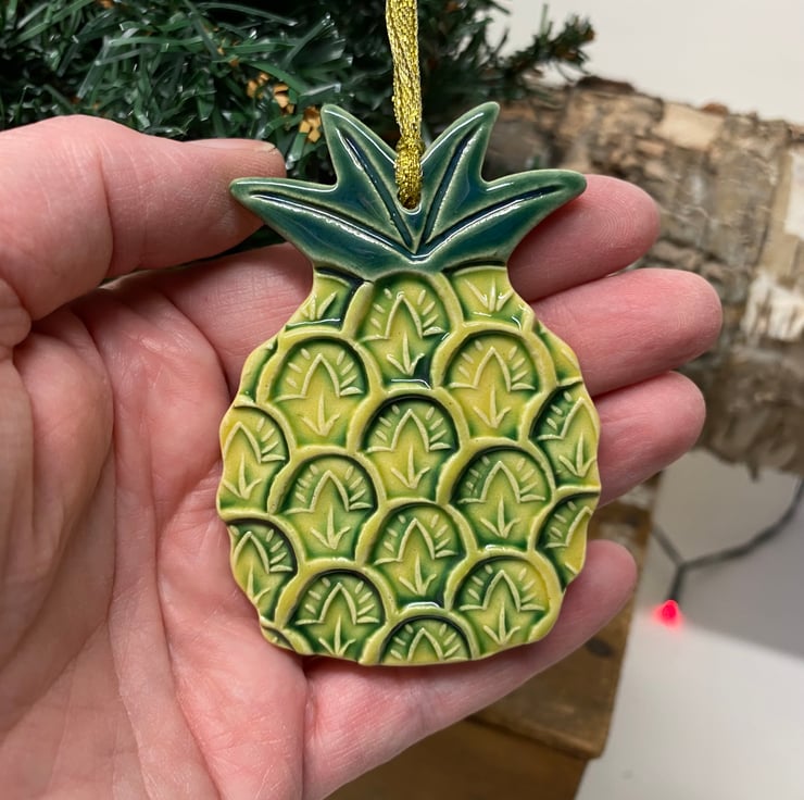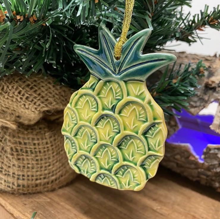 This little pineapple has been cut from white earthenware clay, decorated with a teeny little stamped design that I made myself and then fired. It has then been glazed with a lovely yellow and green glossy glaze and fired again to 1100 degrees. It hangs from a gold ribbon. 7.5cm high x 5.5 cm wide