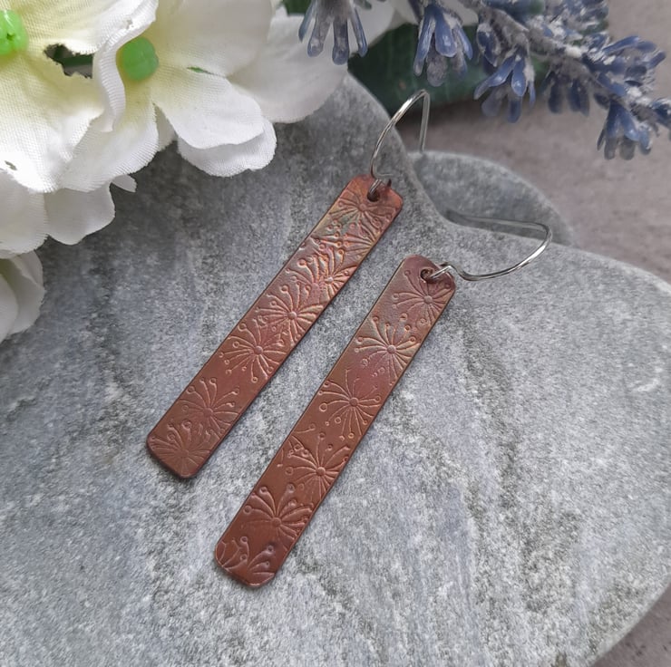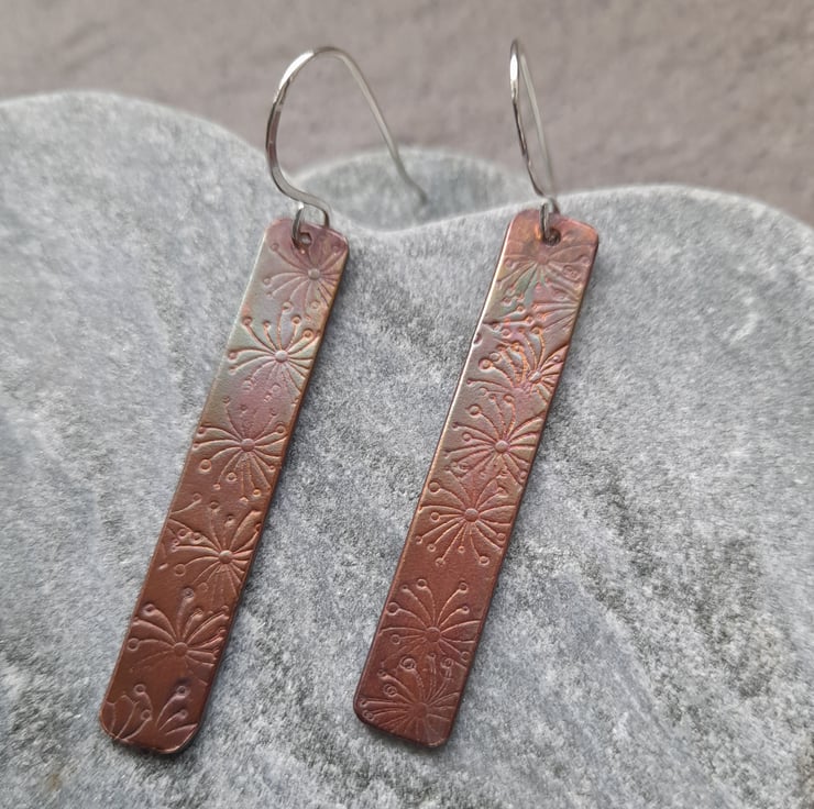 Copper which has been stamped with a pattern of a dandelion and oxidised to give an aged look, you can sometimes see other colours of blues to green in the copper as they move in the light. the copper bars have then been attached to sterling silver handmade ear wires
